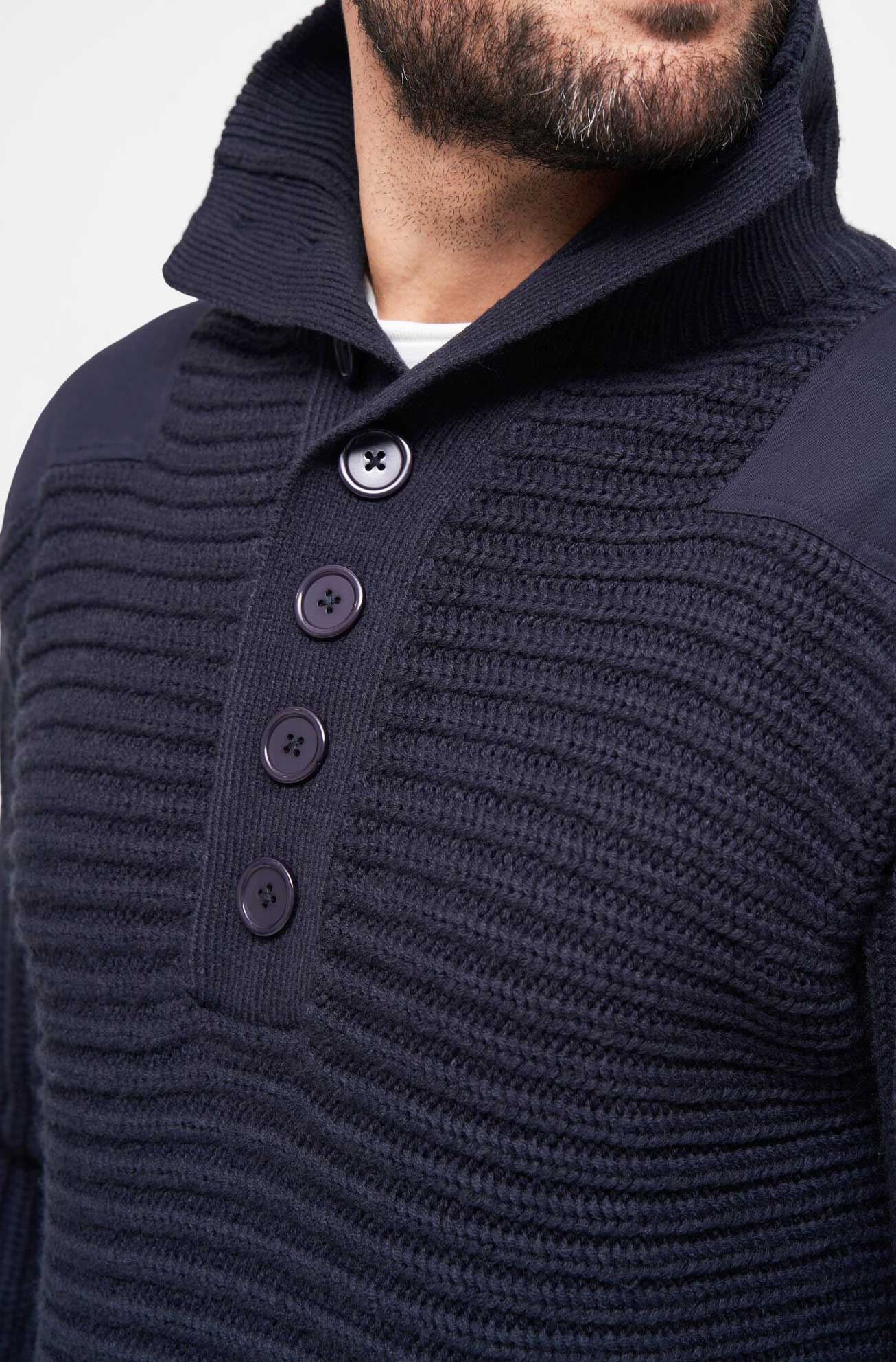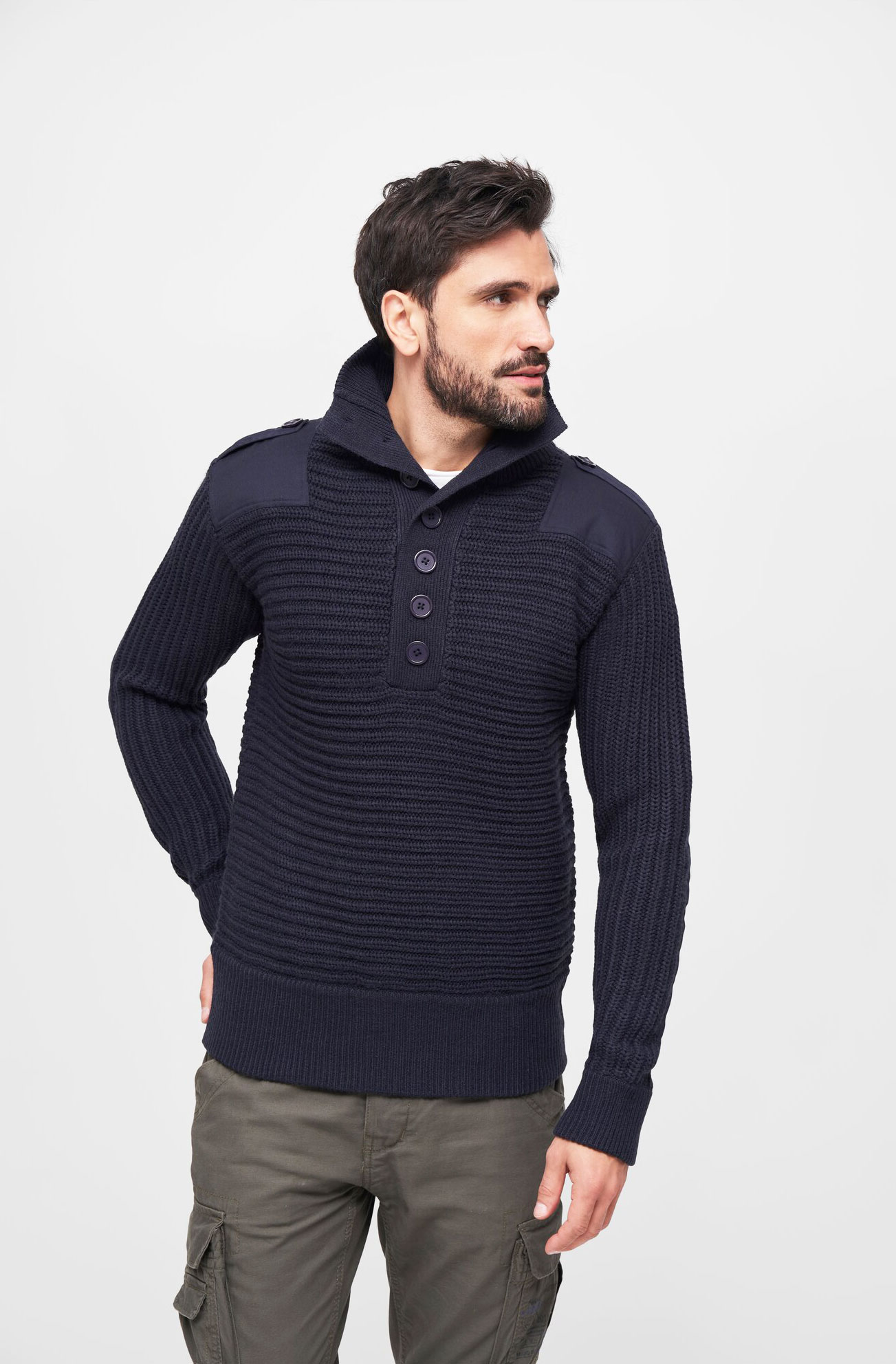 zeitloser Grobstrickpullover / Design nach Vorbild des österreichischen Alpin Armee Pullovers / weiches, angenehmes Tragegefühl ohne Kratzen / breite Strickbündchen an Ärmeln und Saum / hoher Kragen mit Knopfleiste / Schulterklappen mit Knopfverschluss / verstärkte, robuste Ellenbogen- und Schulterpartie