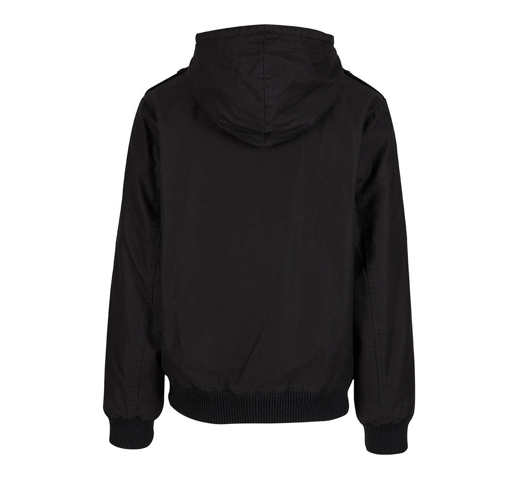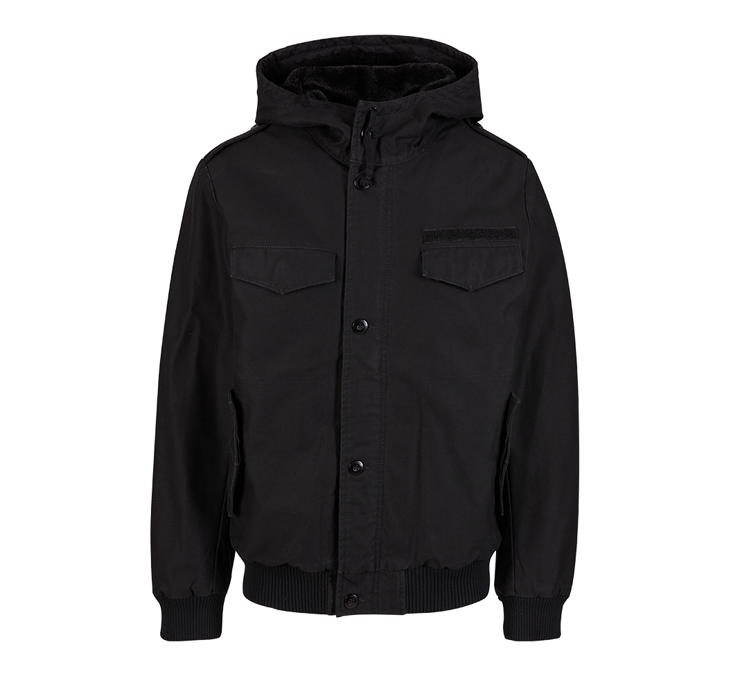 gefütterte Kurzjacke mit Kapuze / warme Teddyfellfütterung / robuster Baumwolloberstoff / 2 Brust-, 2 Einschubtaschen mit Taschenpatte / Reissverschluss mit Windschutzleiste / Strickrippbündchen am Saum und Ärmelenden / Innentasche / Klettfläche auf linker Brust / Schulterklappen / schwere Qualität