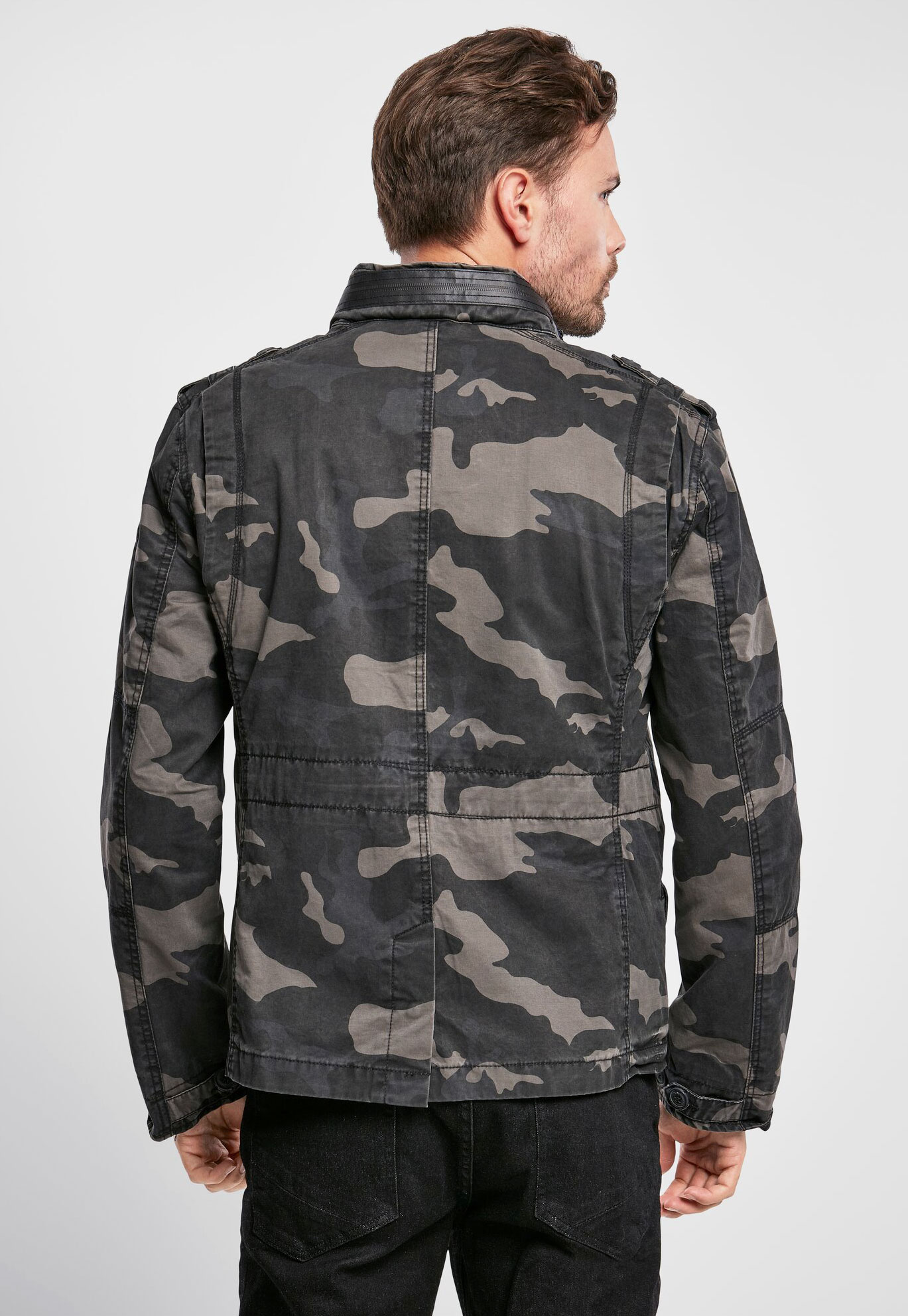 modifizierte Feldjacke / Logo Badge / versteckte Kapuze im Kragen / Stehkragen mit Kunstlederapplikation (100% Polyurethan) / Used-Effekte