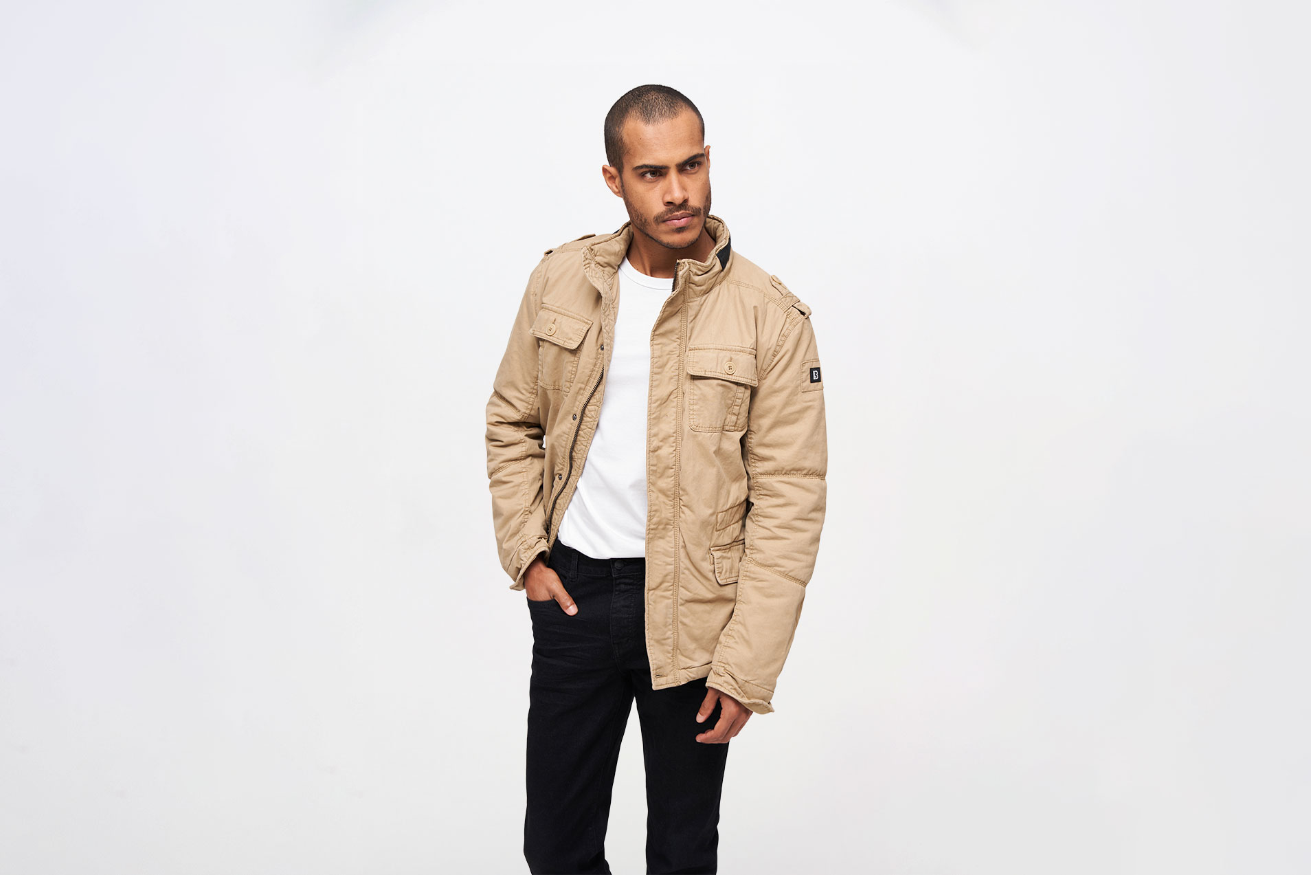 modifizierte Feldjacke / Teddyfutter / Logo Badge / versteckte Kapuze im Kragen / Stehkragen mit Kunstlederapplikation (100% Polyurethan) / Used-Effekte