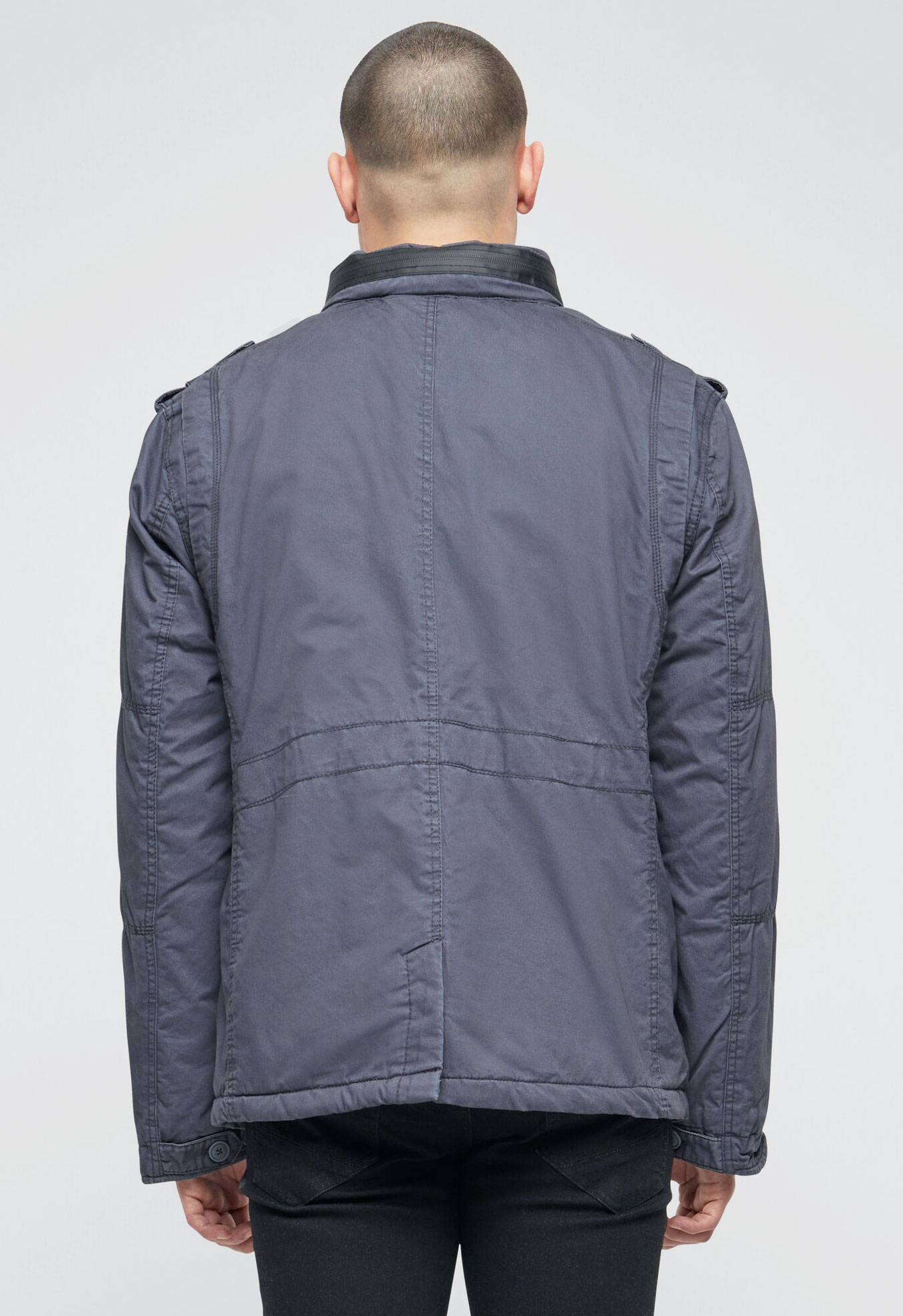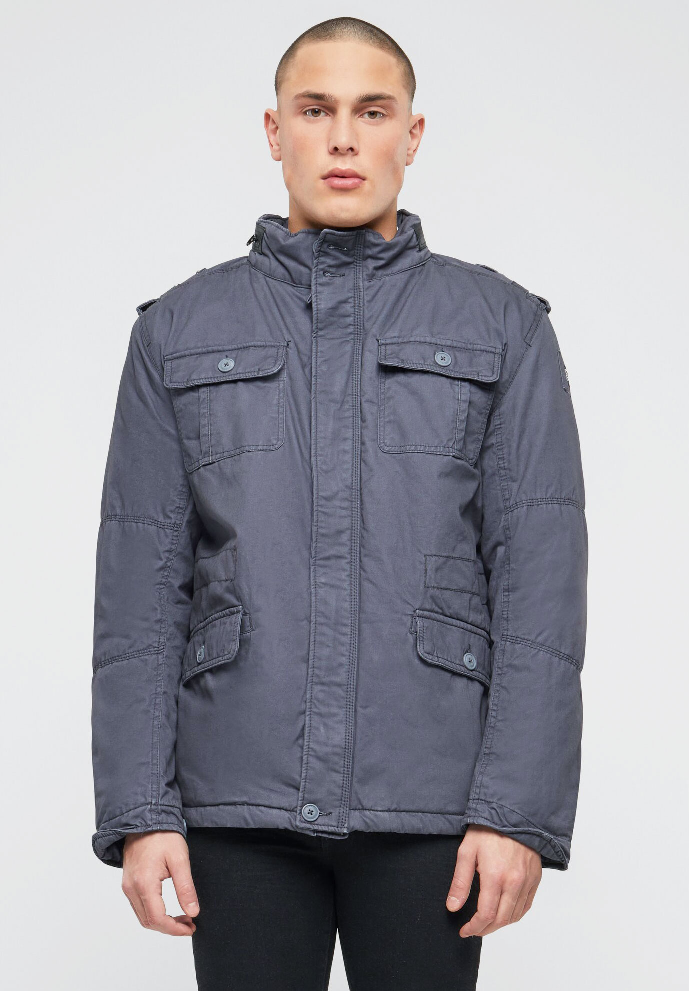 modifizierte Feldjacke / Teddyfutter / Logo Badge / versteckte Kapuze im Kragen / Stehkragen mit Kunstlederapplikation (100% Polyurethan) / Used-Effekte