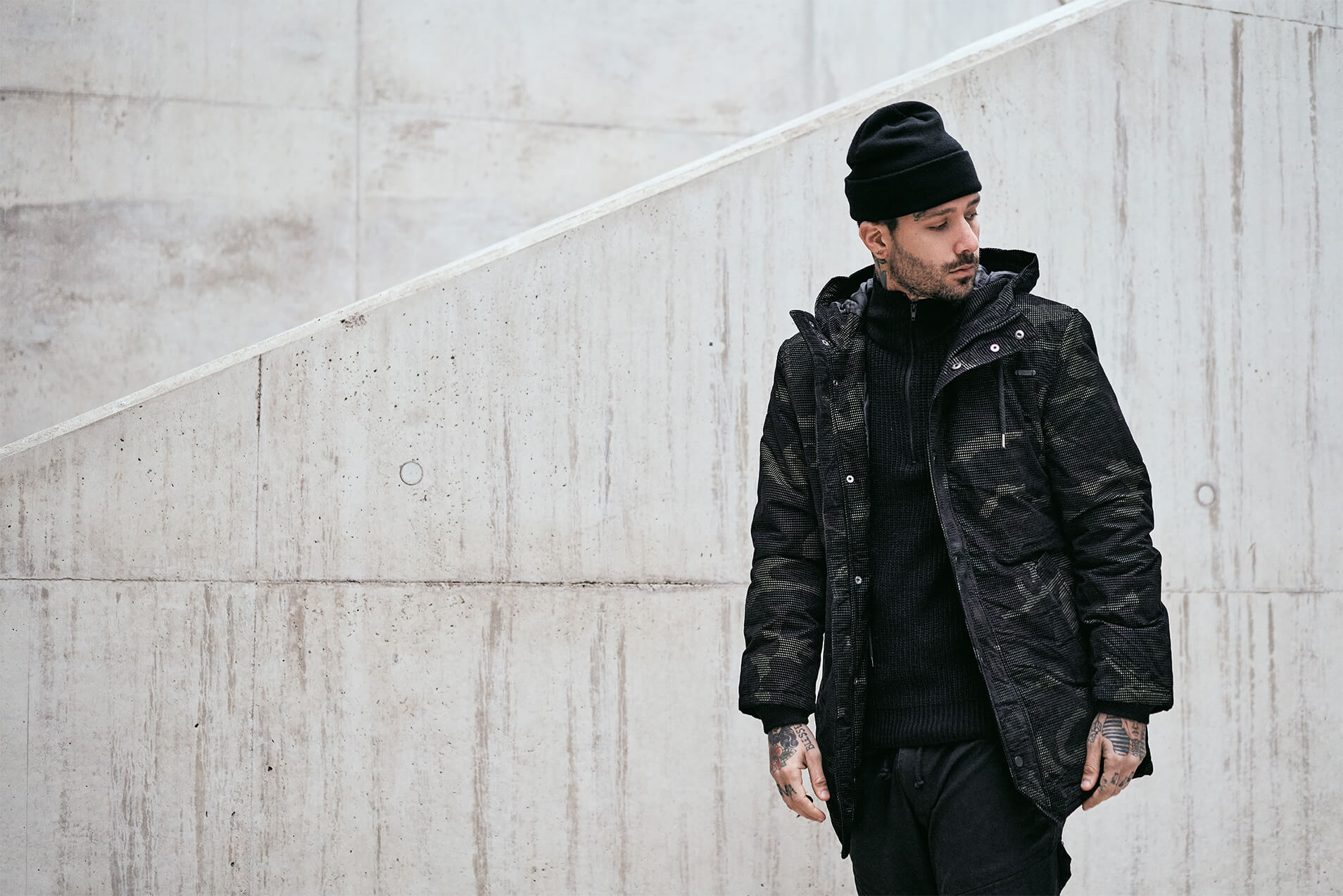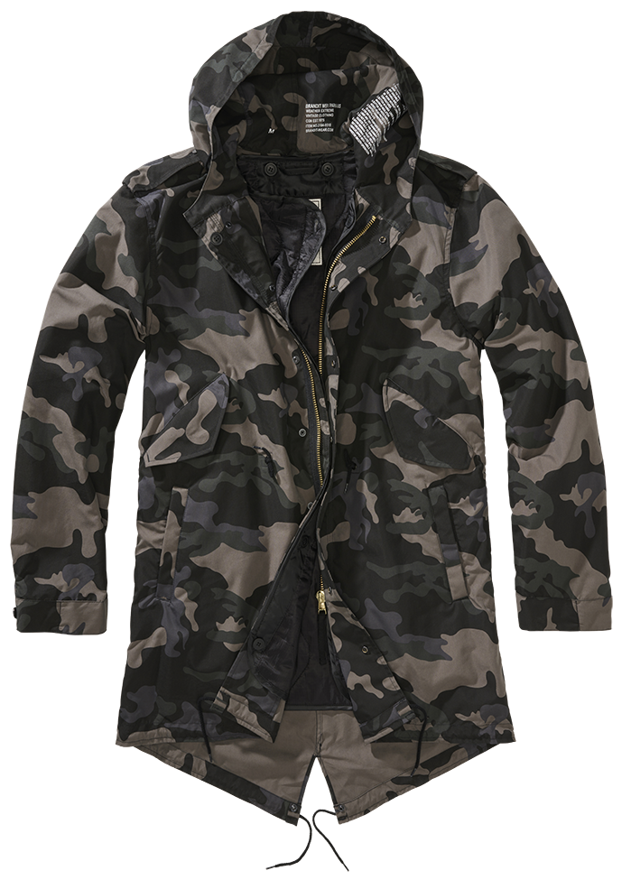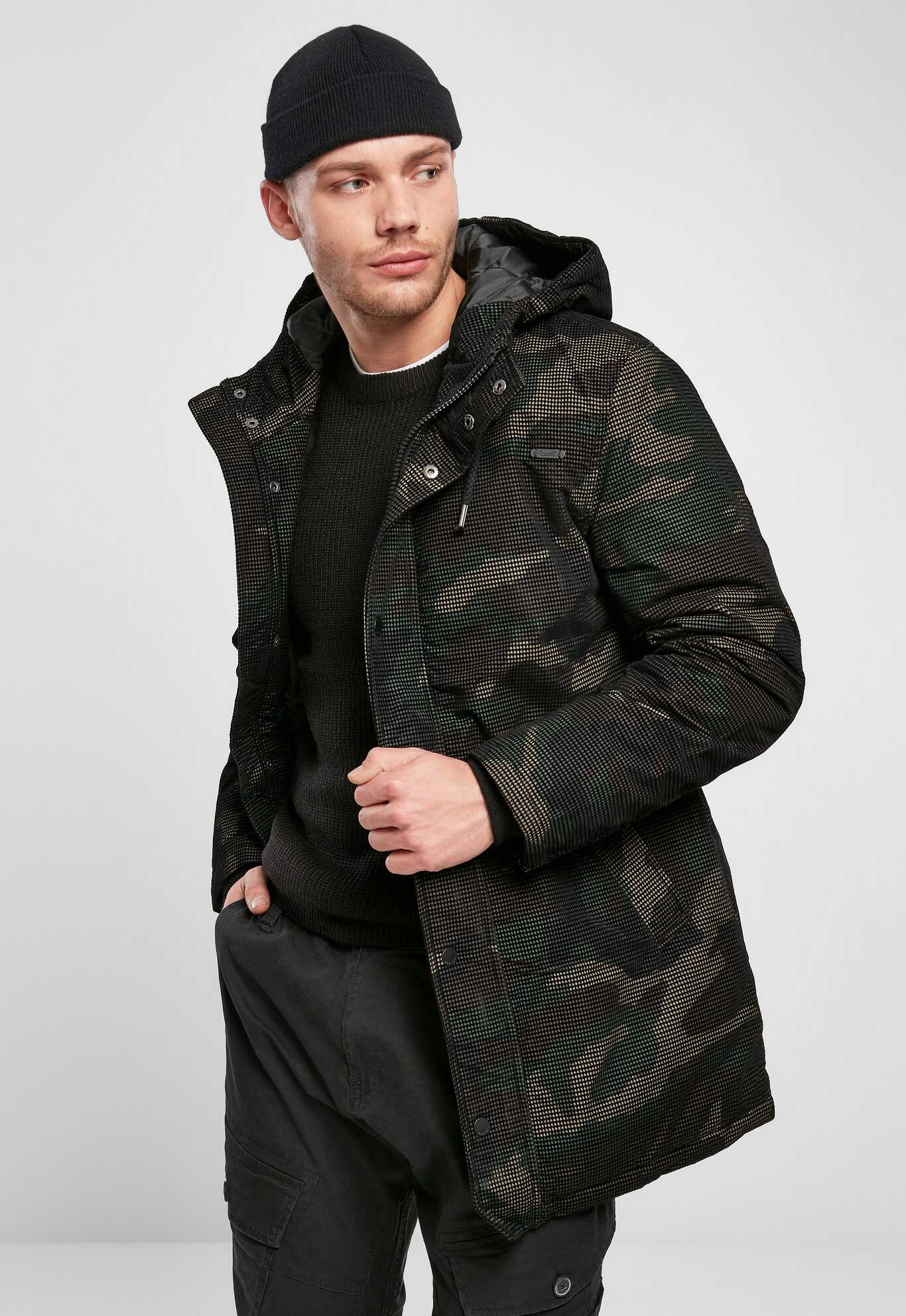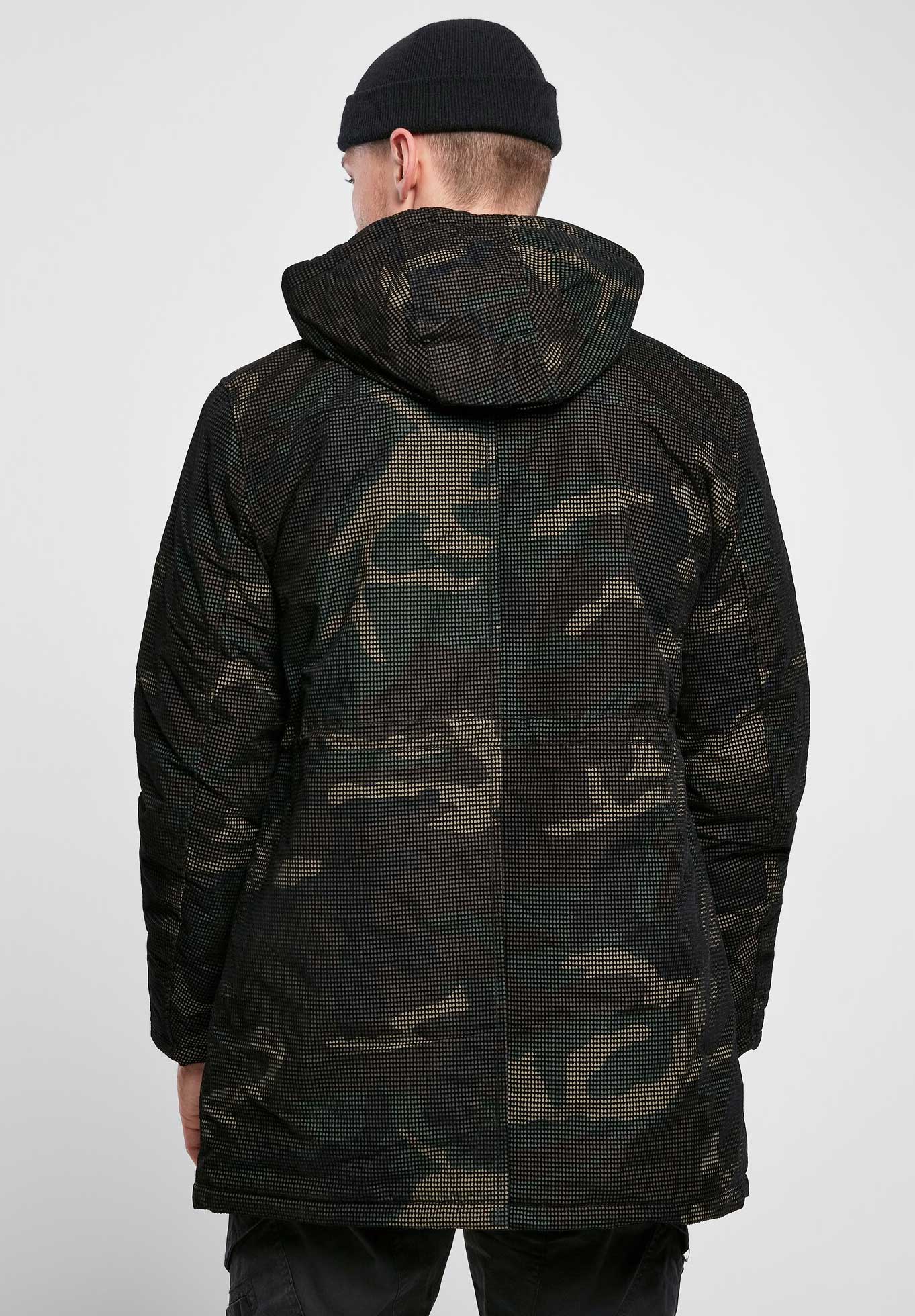 innovative, strukturierter Oberfläche / hohe Isolationsleistung / Kapuze mit Kordelzug / langer Schnitt / zwei seitliche Einschubtaschen / Innentasche / stabiler Reißverschluss / Windschutzleiste mit Druckknopfverschluss / Ärmel mit weichen, hochwertigen Bündchen / weitenregulierbare Taille / Woodland-Muster / Logo Knöpfe