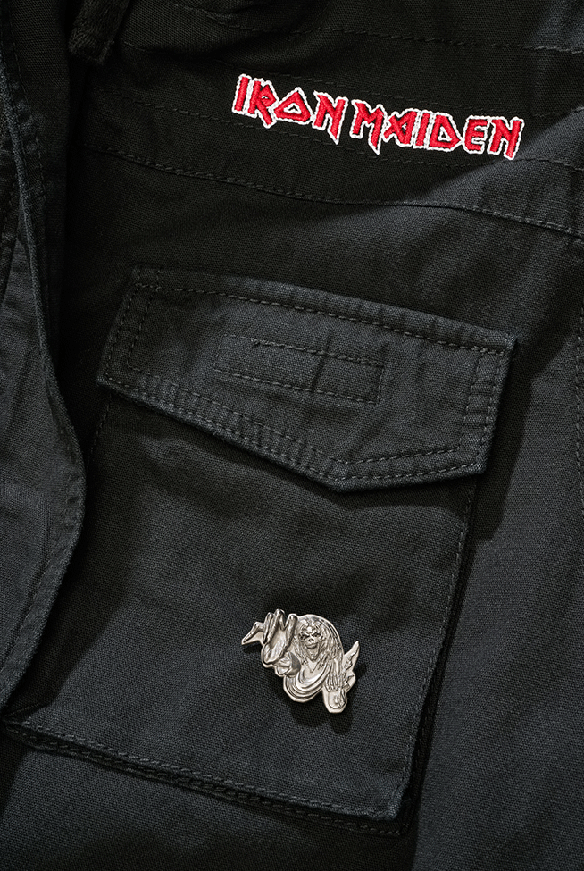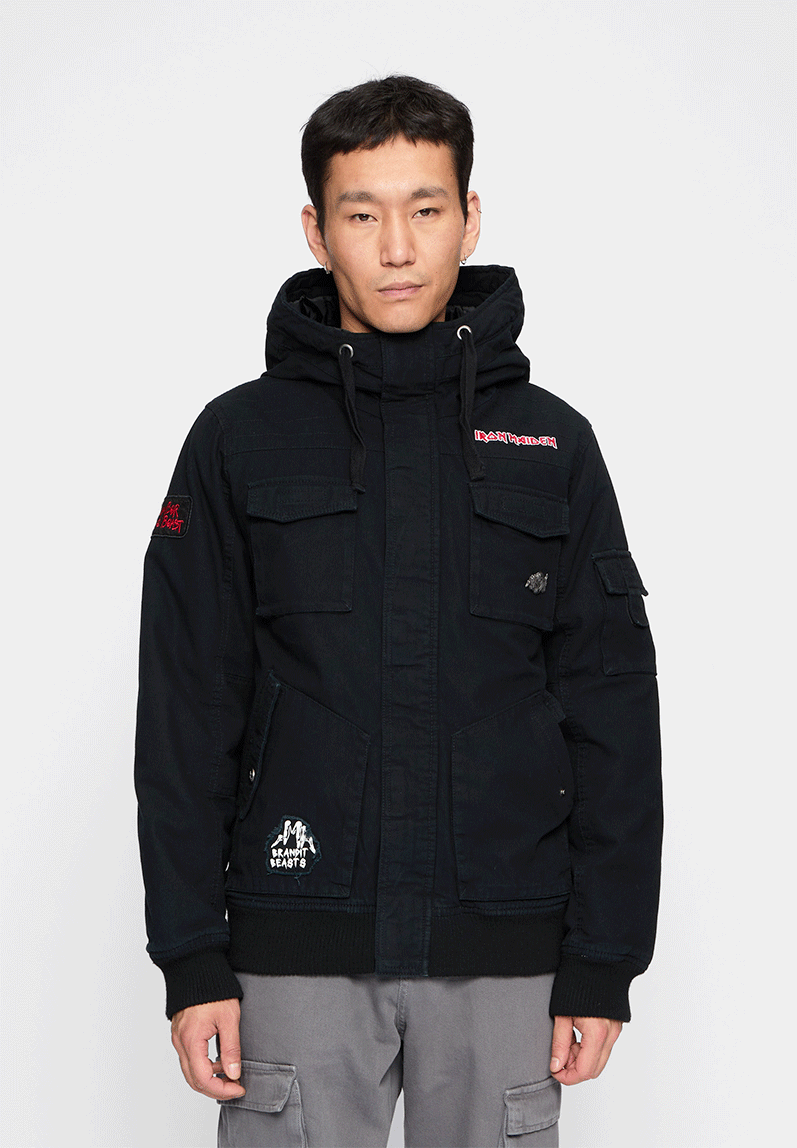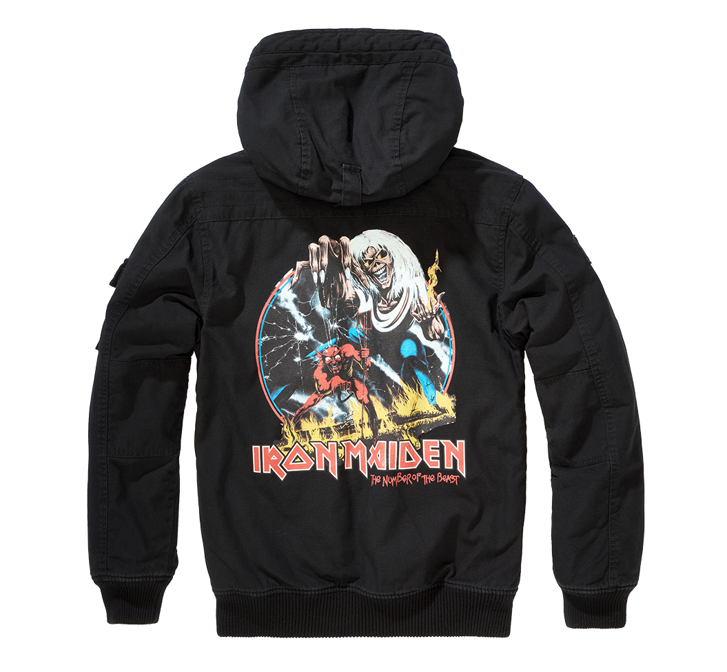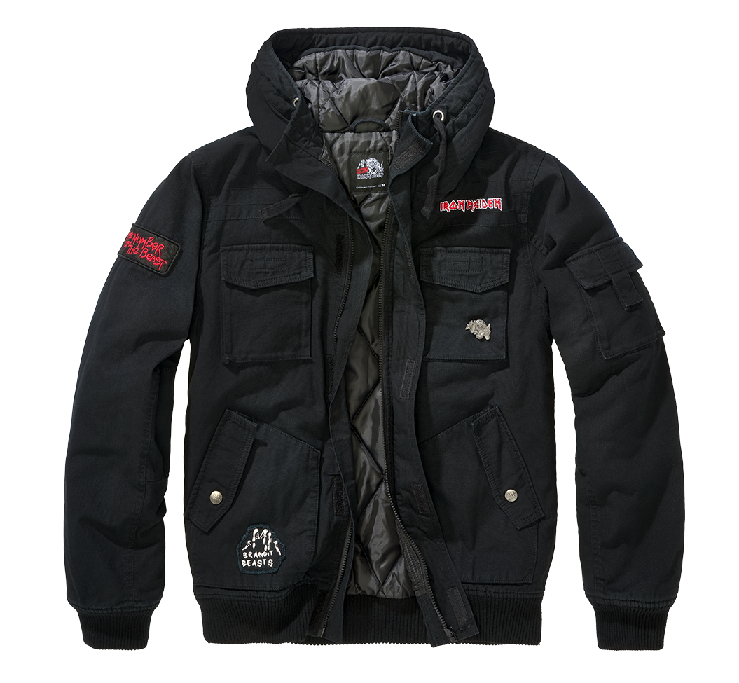 Kurzjacke / NOTB Patch auf dem Oberarm / hochwertiger Iron Maiden Stick auf der Brust / Brandit Beasts Patch auf Fronttasche / Logobuttons / abnehmbarer Eddi Logopin auf der Brusttasche / großer mehrfarbiger NOTB Print auf dem Rücken / breiter Arm- und Hüftbund / extra große Kapuze / gestepptes Innenfutter