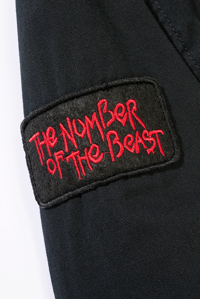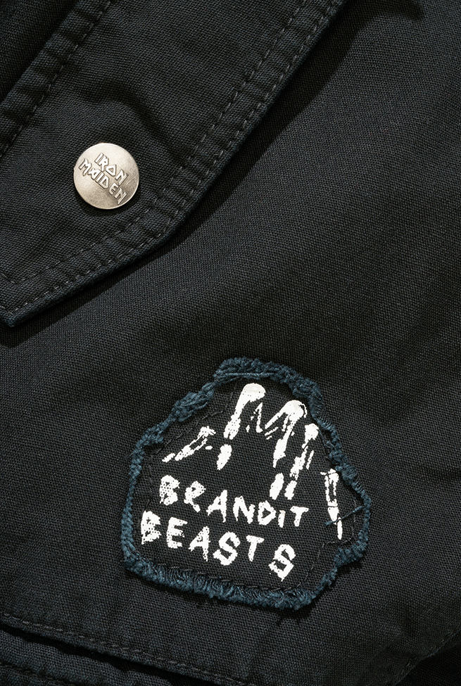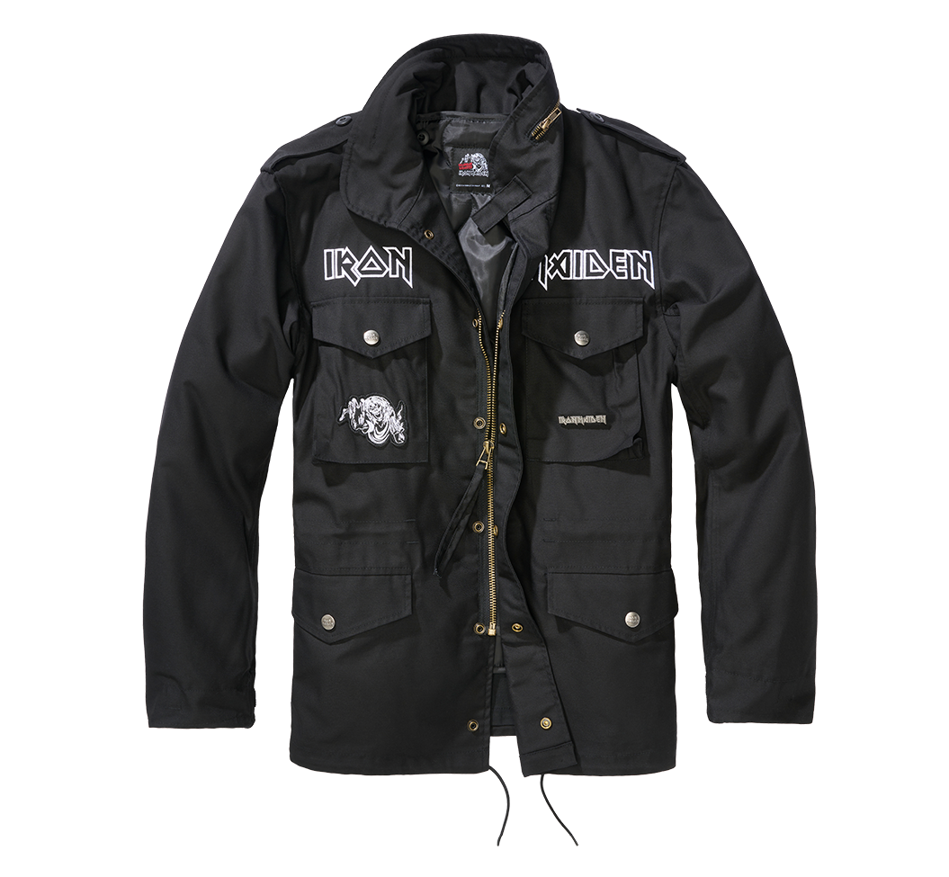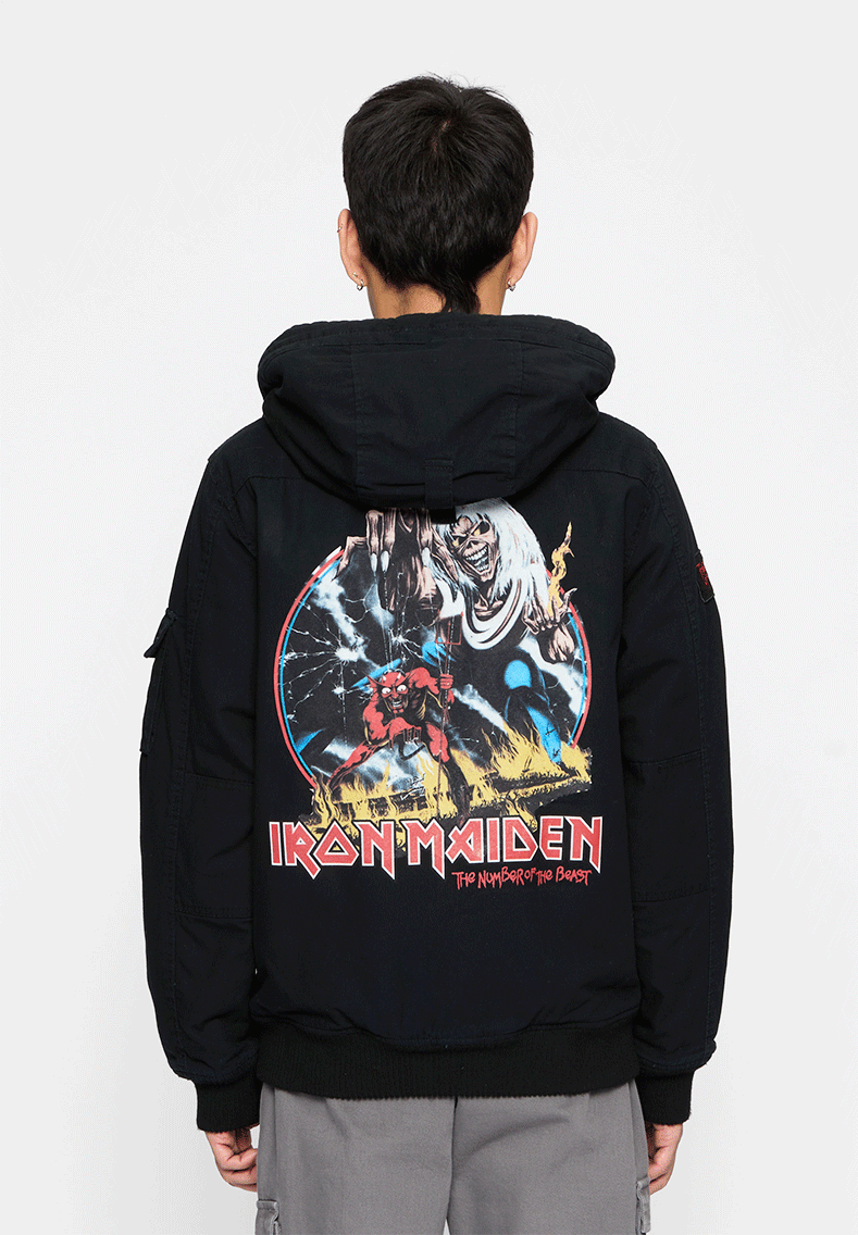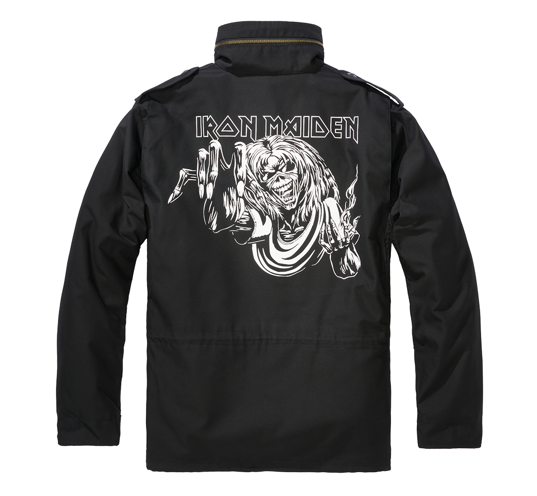 Kurzjacke / NOTB Patch auf dem Oberarm / hochwertiger Iron Maiden Stick auf der Brust / Brandit Beasts Patch auf Fronttasche / Logobuttons / abnehmbarer Eddi Logopin auf der Brusttasche / großer mehrfarbiger NOTB Print auf dem Rücken / breiter Arm- und Hüftbund / extra große Kapuze / gestepptes Innenfutter