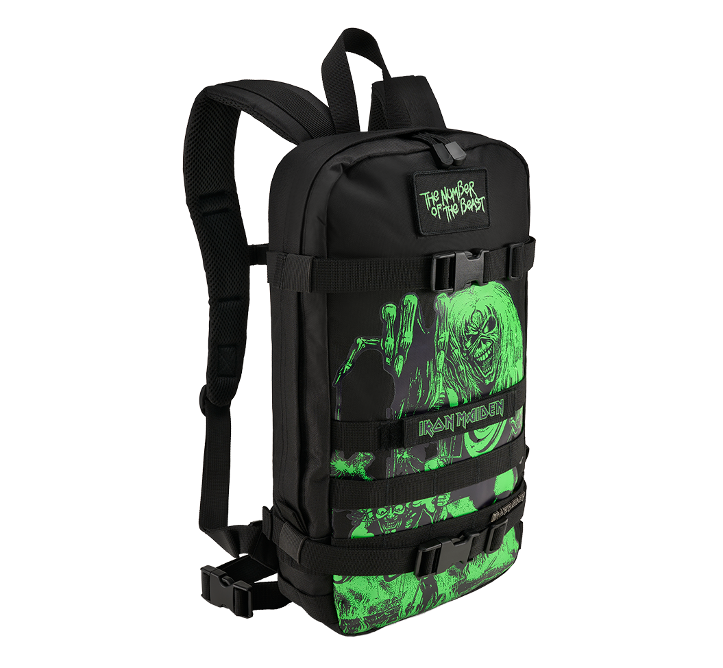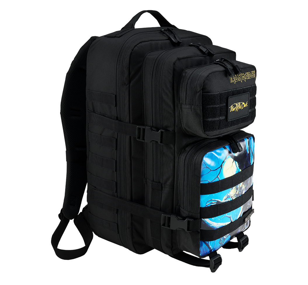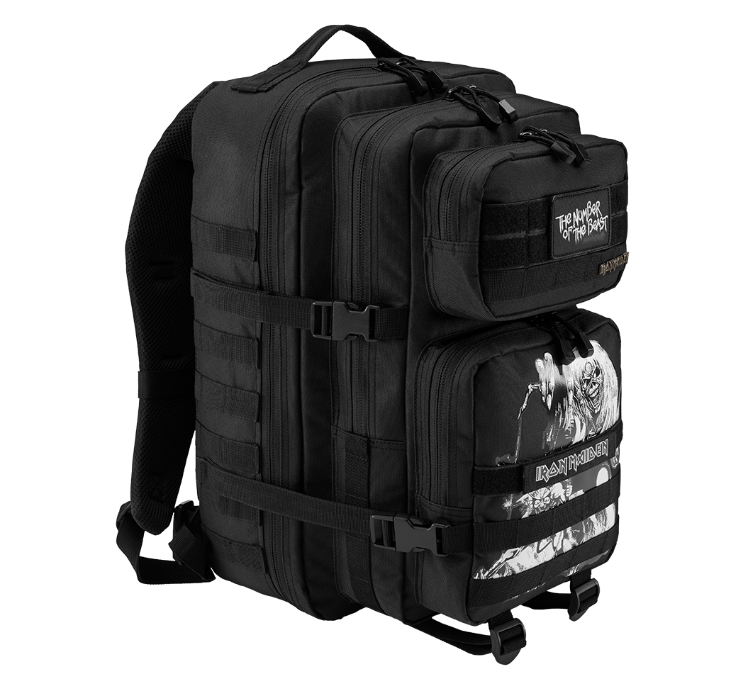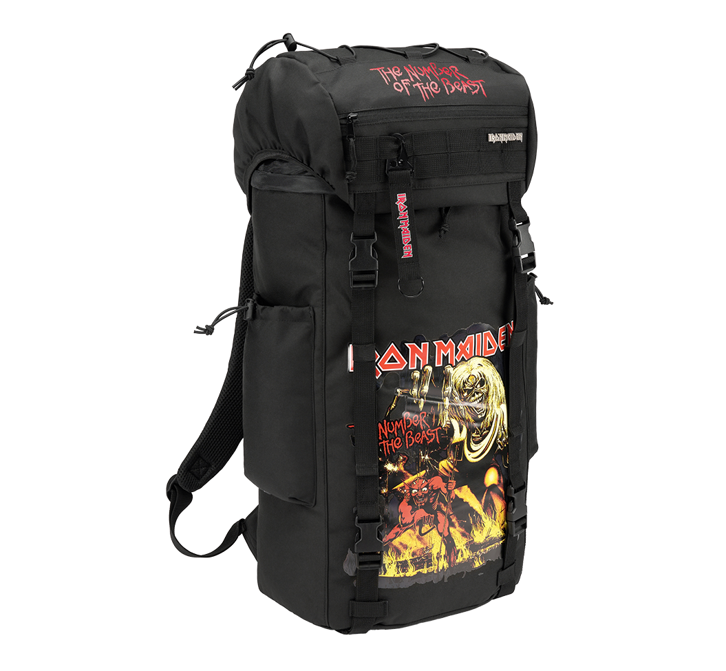 mit großen Iron Maiden Logos / 2 seitliche Taschen für Flaschen oder Zubehör / aufgesetzte Fronttasche mit Molle Bändern / Boden mit Gurten zum Anbringen von Isomatten oder Schlafsäcken / abnehmbarer Hüftgurt mit Tasche - auch als einzelne Bauchtasche zu tragen / Deckelfach mit Gummiband zum Anbringen von Jacken etc. / Deckelfach mit zusätzlichem Dokumentenfach außen und innen / gepolsterte Schultergurte inkl. Flaschenöffner / gepolstertes Rückteil mit hinterlegtem Laptopfach / stabiler Tragegriff / +Sitzmatte +Schlüsselanhänger +Raincover +Wäschenetz