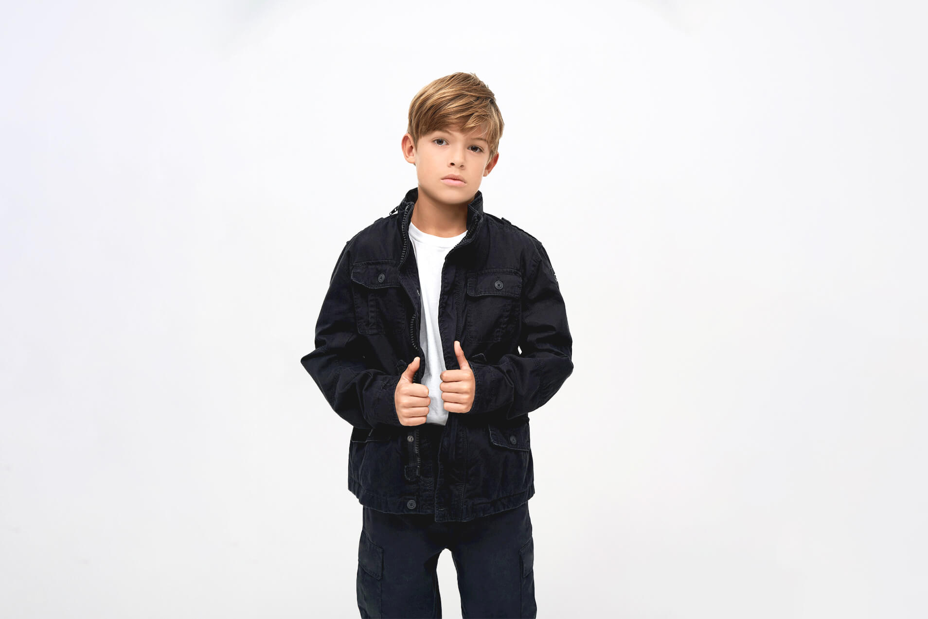 zeitlose Kinderjacke im Feldjacken-Design / versteckte Kapuze im Kragen / Stehkragen mit Kunstlederapplikation (100% Polyurethan) / Belüftungslöcher im Achselbereich / 4 Fronttaschen / 1 Innentasche / Armabschluss mit Klettverschluss / leichter Used-Look