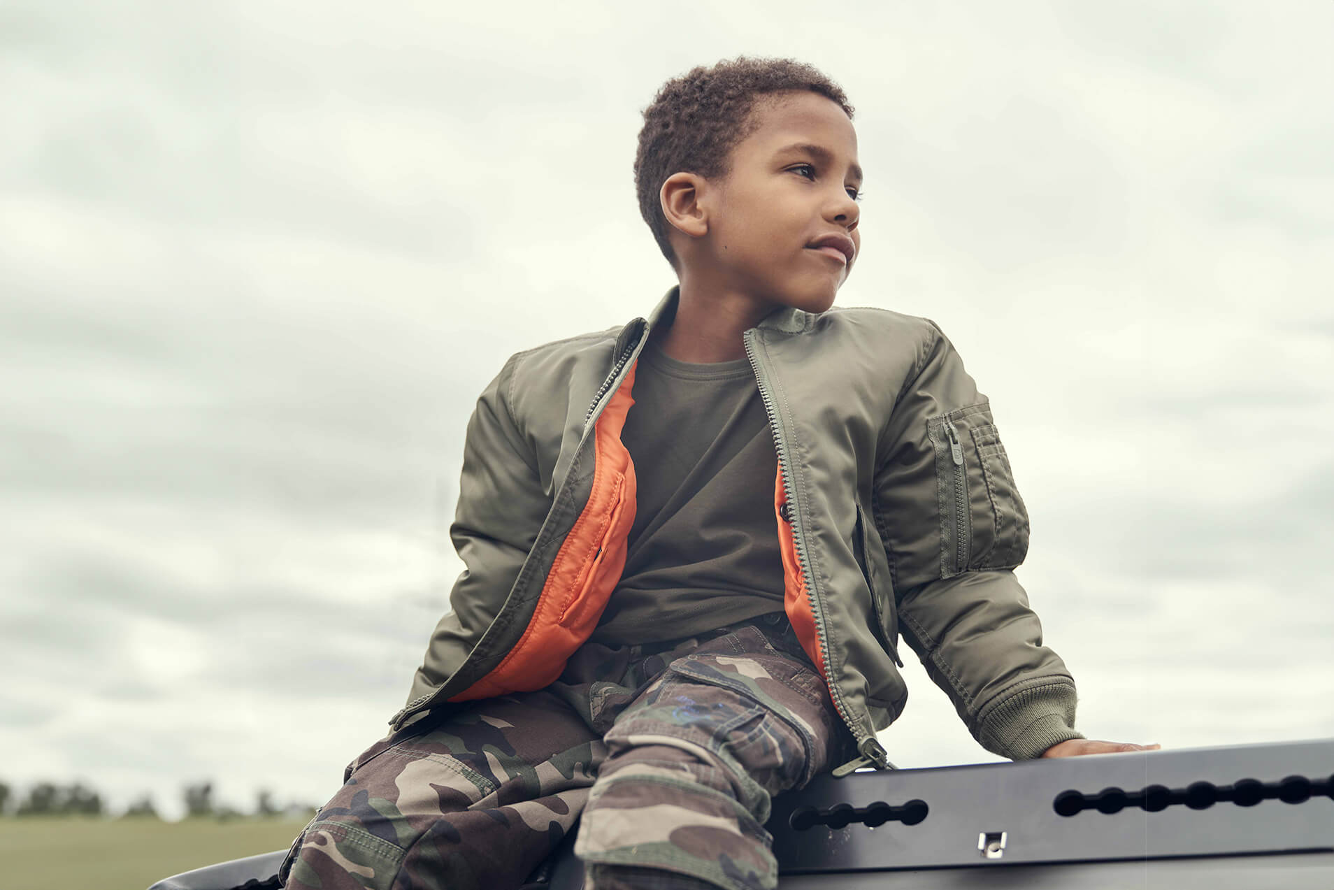 angesagte, zeitlose Kinder–Bomberjacke / wind- und wasserabweisende Wendejacke / strapazierfähiges, hochwertiges Nylonmaterial / 2 seitliche Einschubtaschen mit Patten / Oberarmtasche mit Reißverschlussfach und Armbüro / Strickbund an Kragen, Ärmeln und Saum