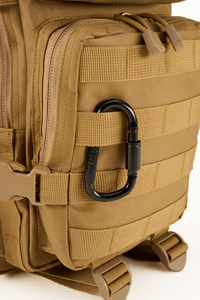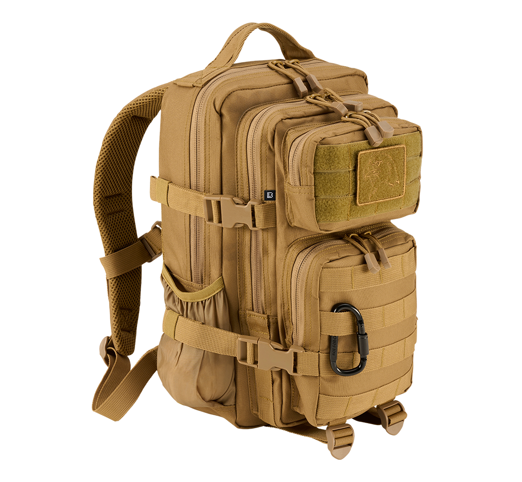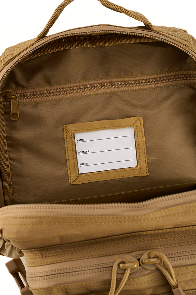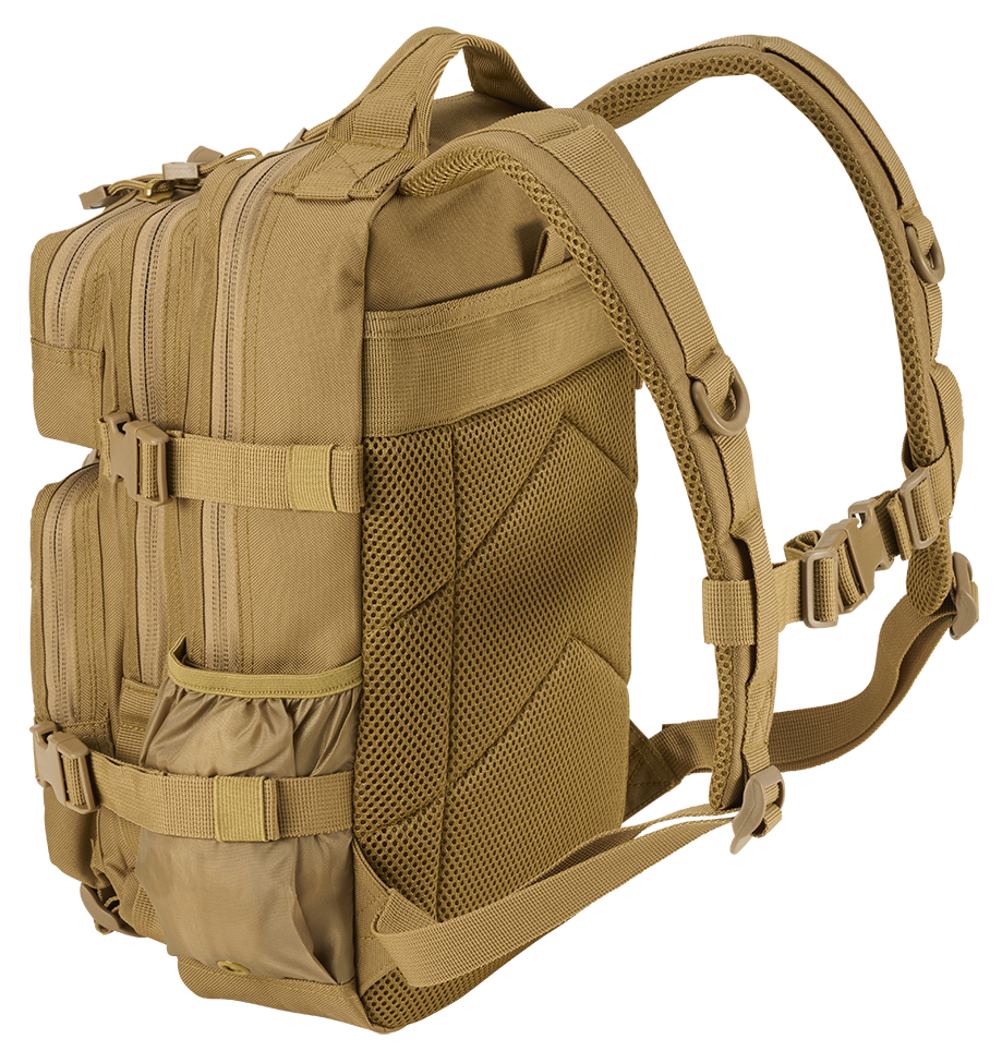 robustes, beschichtetes Außenmaterial (600D) / gepolsterte Schultergurte / verstellbarer Brustgurt / seitliche, dehnbare Taschen für Regenschirme, Trinkfalschen etc. / innenliegendes Klarsichtfach mit Blanko-Kontaktbogen / robuster Karabinerhacken inklusive (nicht zum Klettern geeignet) / Klettfläche für Patches / Adler-Patch inklusive / 3 aufgesetzte Fronttaschen (2 mit Organizer) / D-Ring zum Anbringen von Schlüsseln etc. / seitliche Kompressionsgurte / Reverse-Reißverschlüsse / Molle-Schlaufen