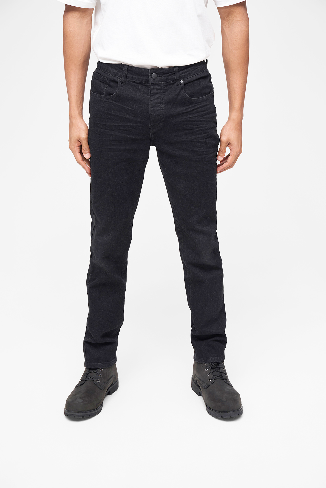 ungewaschene Optik / hoher Tragekomfort durch Elasthan / normaler Bund / Knopfleiste / Straight Fit / 2 Einschubtaschen / 2 Gesäßtaschen
