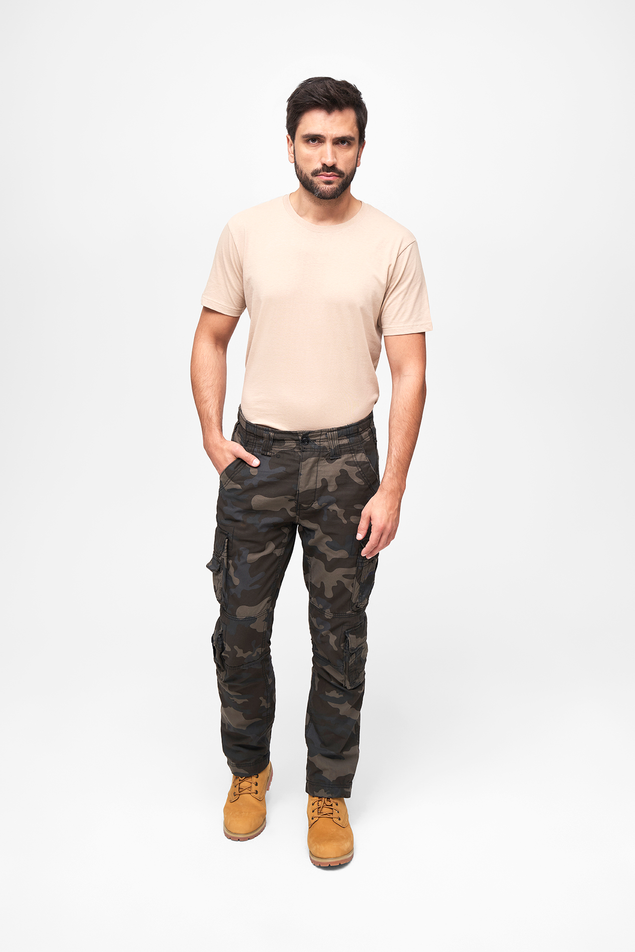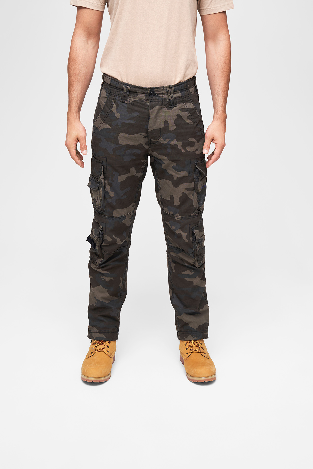 stylische Slim Fit Cargohose / robustes, hautfreundliches Baumwollmaterial / schmale Passform / regulierbarer Bundumfang mittels Tunnelzug / hochwertige Knopfleiste / 2 seitliche Einschubtaschen / 4 praktische Cargotaschen mit Druckknopfverschluss / 2 Gesäßtaschen / stabile Gürtelschlaufen / modischer Print auf einer Cargotasche