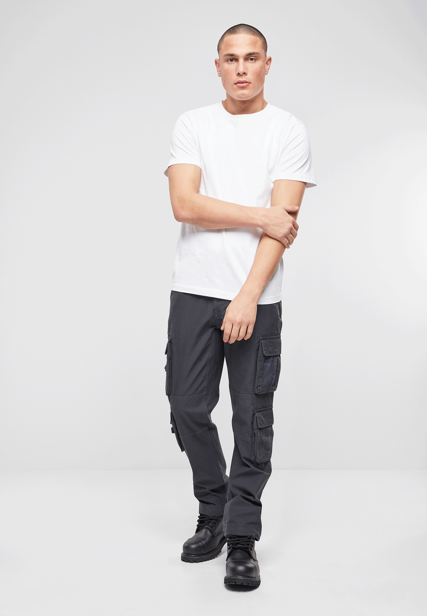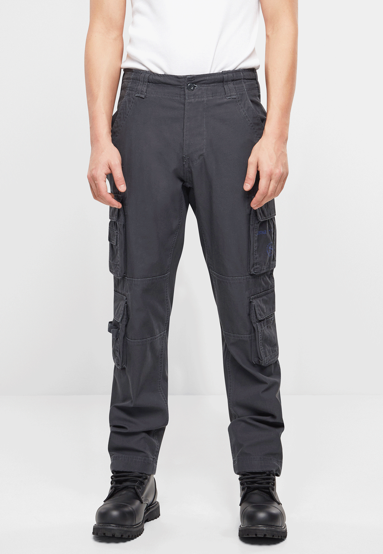 stylische Slim Fit Cargohose / robustes, hautfreundliches Baumwollmaterial / schmale Passform / regulierbarer Bundumfang mittels Tunnelzug / hochwertige Knopfleiste / 2 seitliche Einschubtaschen / 4 praktische Cargotaschen mit Druckknopfverschluss / 2 Gesäßtaschen / stabile Gürtelschlaufen / modischer Print auf einer Cargotasche