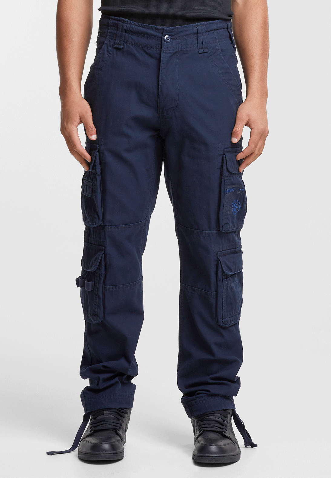 stylische Slim Fit Cargohose / robustes, hautfreundliches Baumwollmaterial / schmale Passform / regulierbarer Bundumfang mittels Tunnelzug / hochwertige Knopfleiste / 2 seitliche Einschubtaschen / 4 praktische Cargotaschen mit Druckknopfverschluss / 2 Gesäßtaschen / stabile Gürtelschlaufen / modischer Print auf einer Cargotasche