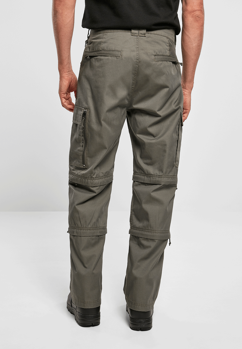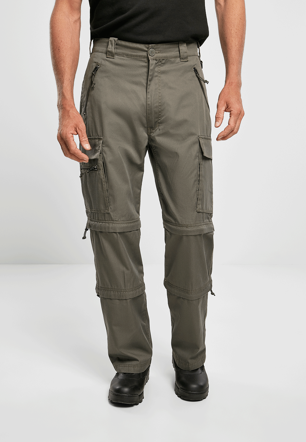 Multifunktions-Trekkinghose / robustes, atmungsaktives und wasserabweisendes Mischgewebe / große Beintaschen mit Klett- und Reißverschluss / Beinabschlüsse mit Reißverschluss / zwei Gesäßtaschen mit Reißverschluss / Einschubtaschen mit Reißverschluss / breite Gürtelschlaufen / gesticktes Brandit-Logo
