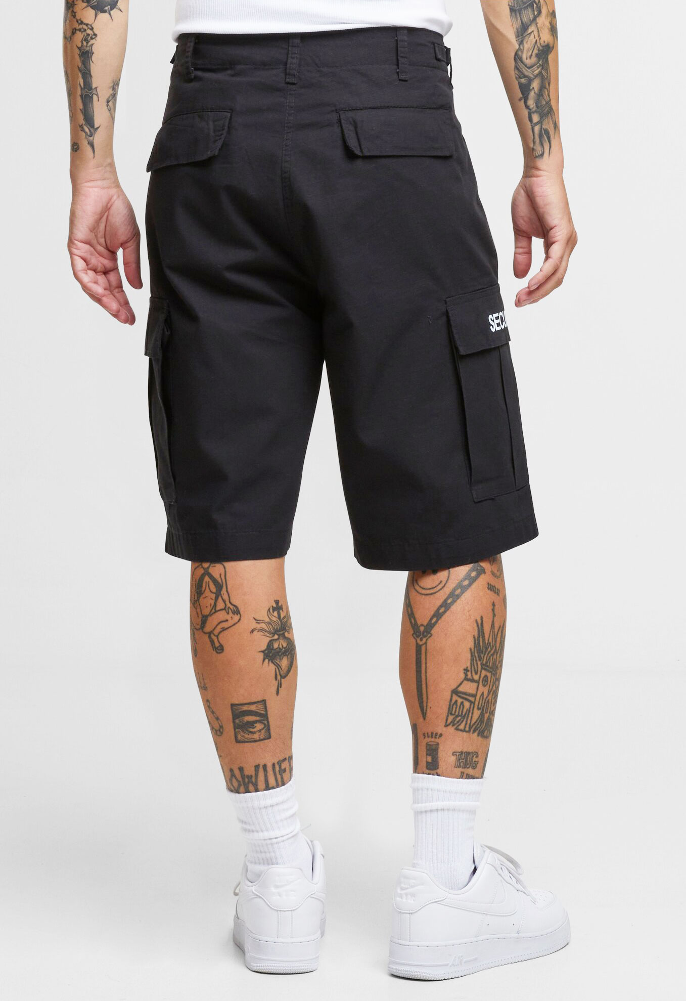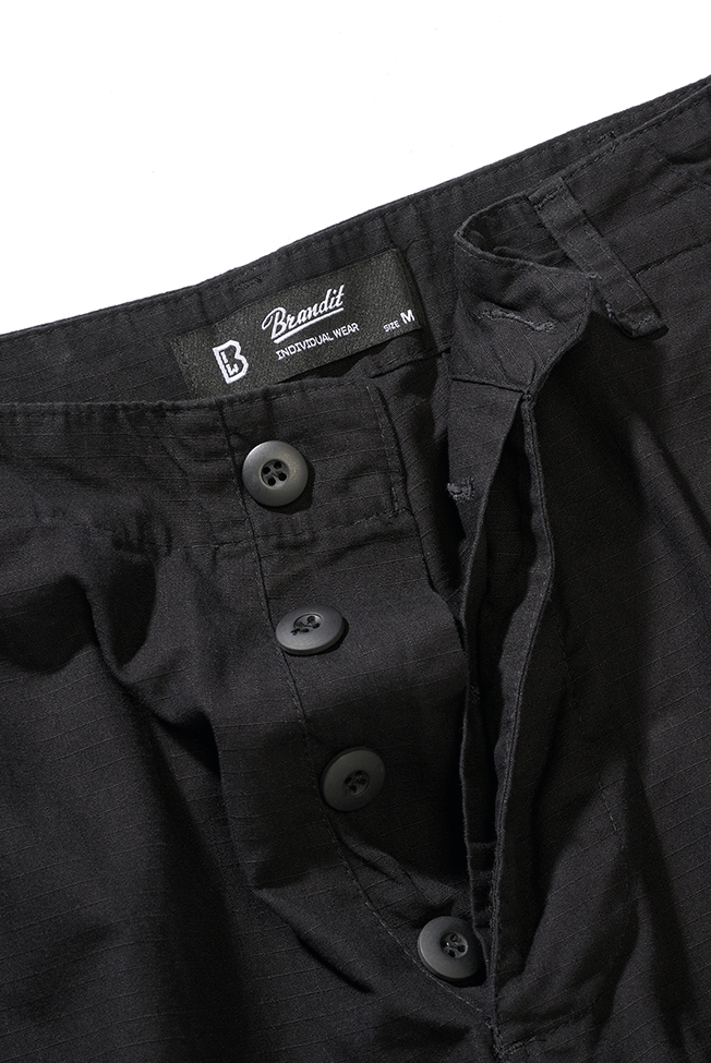 robustes Ripstop Material / "Security" Prints auf beiden großen Cargotaschen / bequemer Schnitt / Knopfleiste / zwei seitliche Einschubtaschen / zwei Gesäßtaschen / weitenregulierbarer Bund