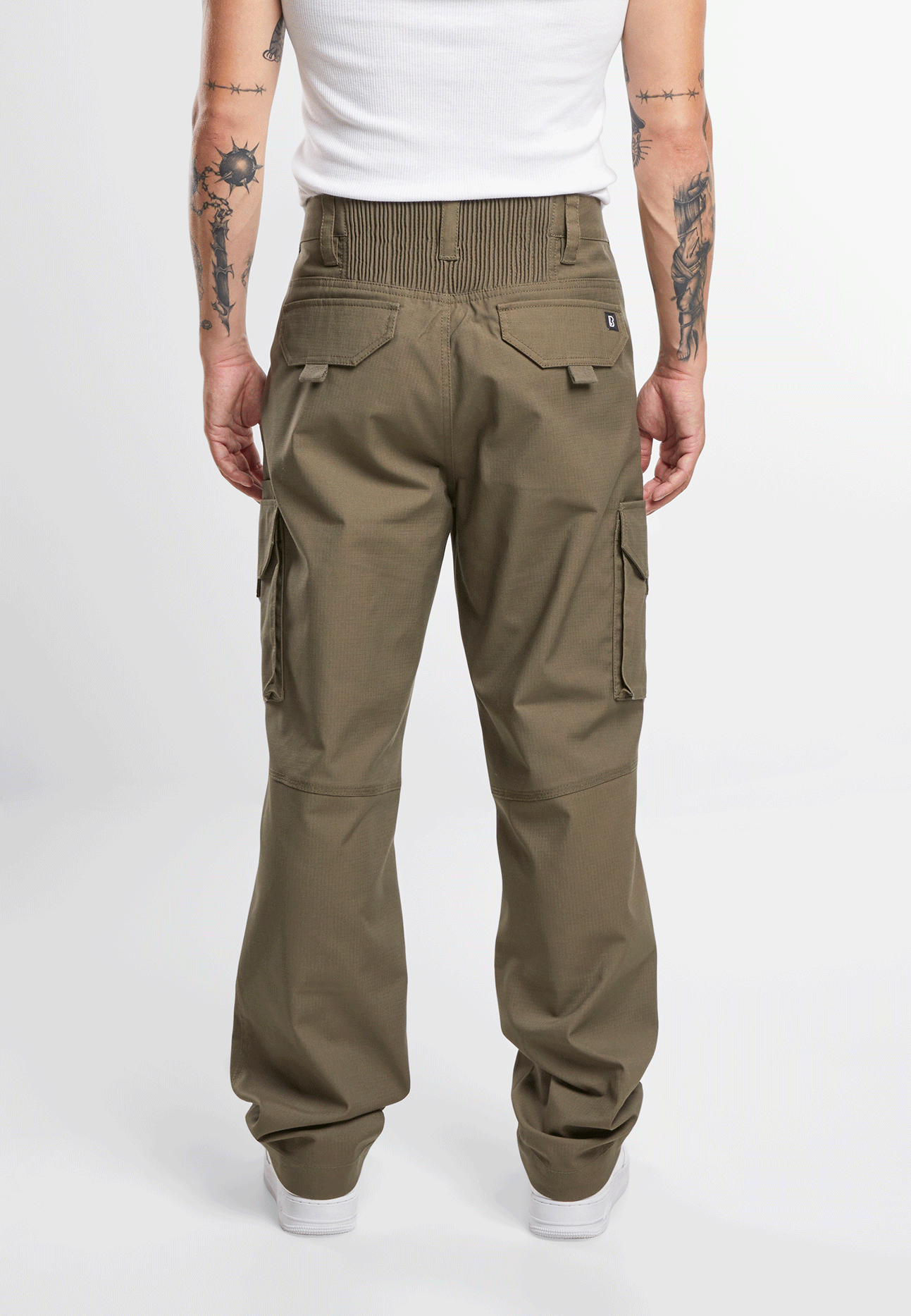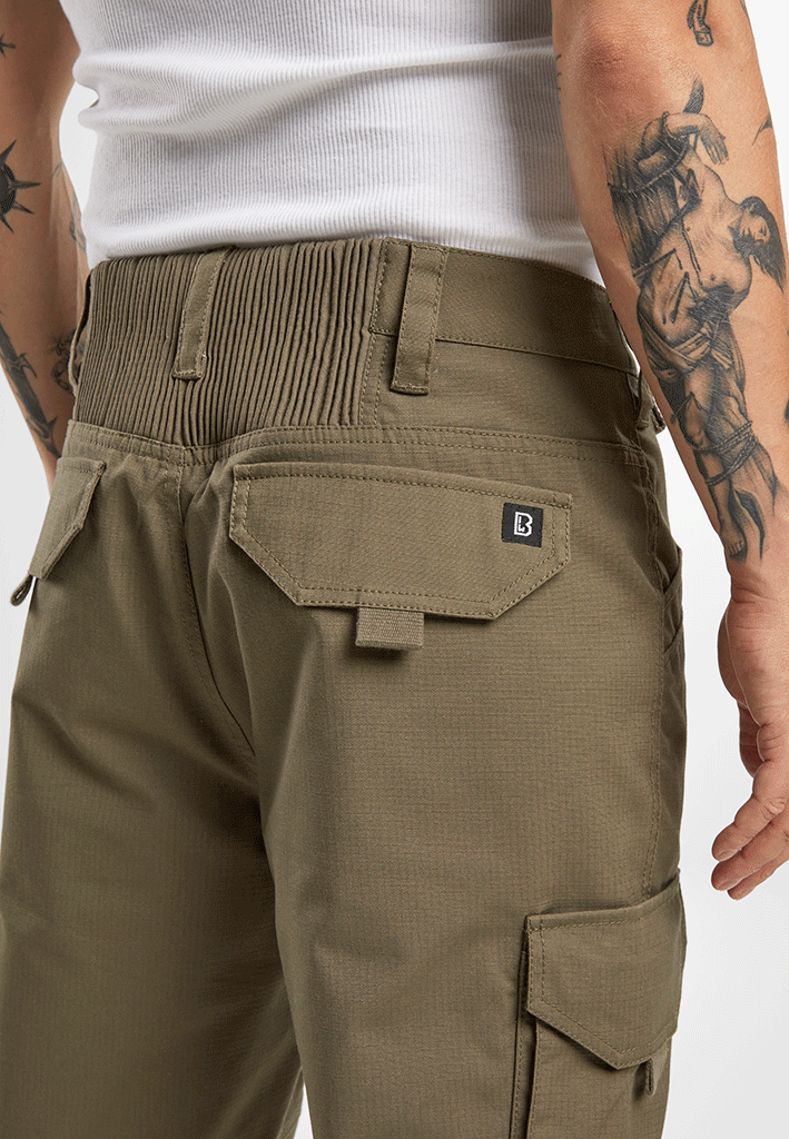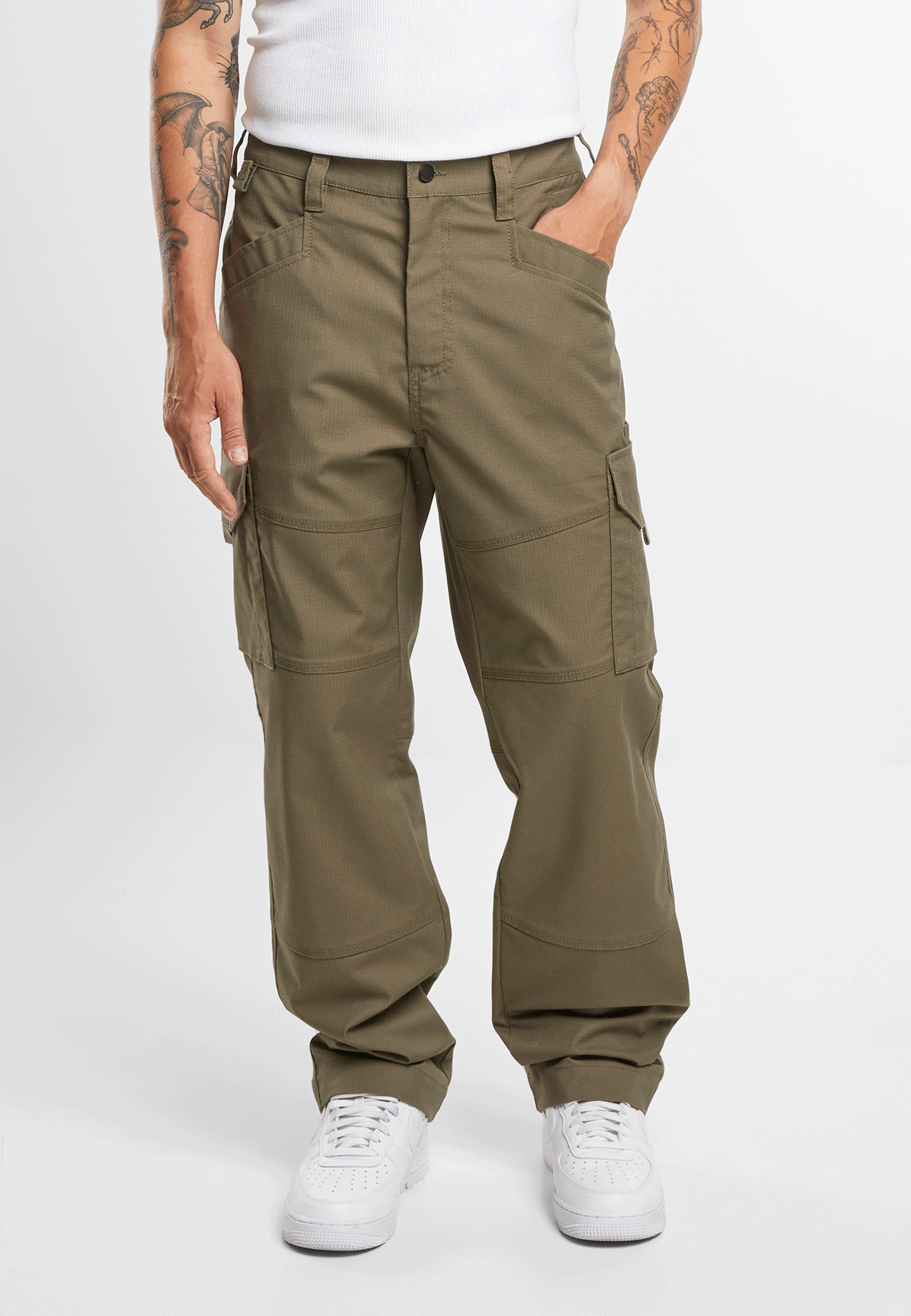 Bund mit elastischem Gummieinsatz / 2 große Einschubtaschen / 2 Gesäßtaschen mit Taschenpatte und Klettverschluss / 2 seitlich aufgesetzte Beintaschen mit Taschenpatte und Klettverschluss / doppelt abgenähter Kniebereich / robustes Ripstopmaterial / hoher Tragekomfort / diverse Gürtelschlaufen / gerader Schnitt / 1 Schlüsselschlaufe