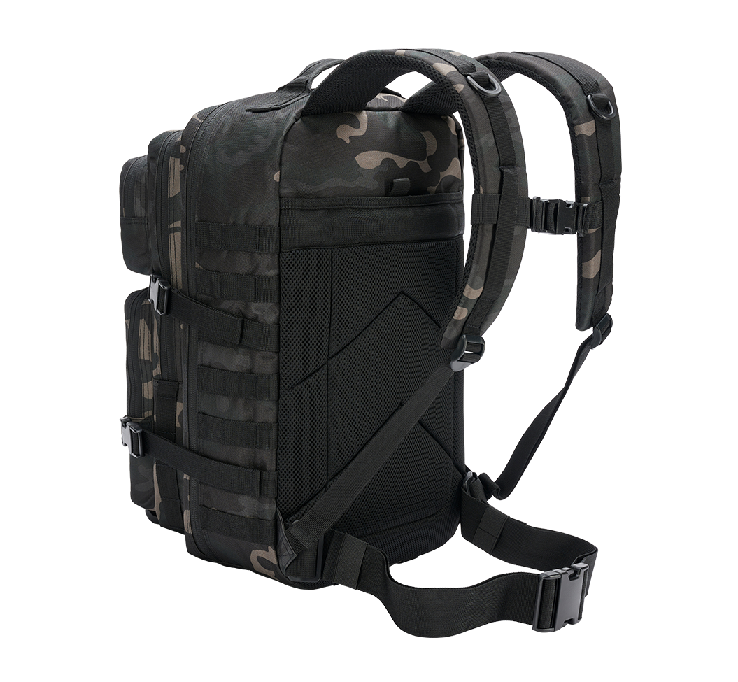 US Assault Pack Large, Molle-System, gepolsterte Schultergurte, D-Ringe, seitliche Kompressionsgurte, Mesh-Getränkefächer, Klettfläche mit Patch, Flag-Label, individuell einstellbarer Brust- Hüftgurt, Tragegriff, inkl. Karabiner, praktische quick-release Verschlüsse, 600DEN Polyester Material