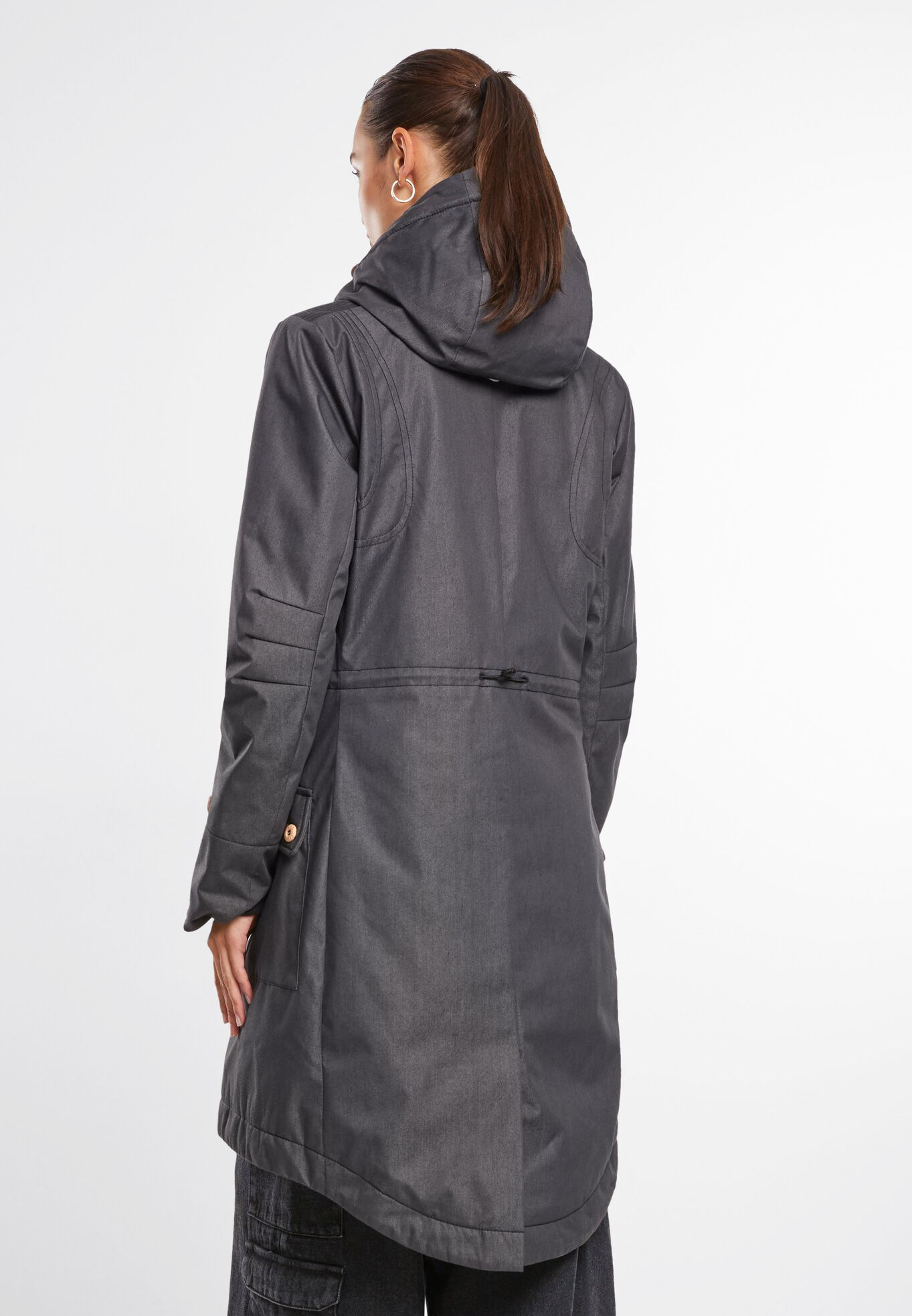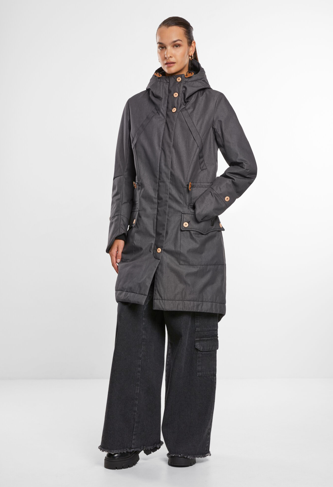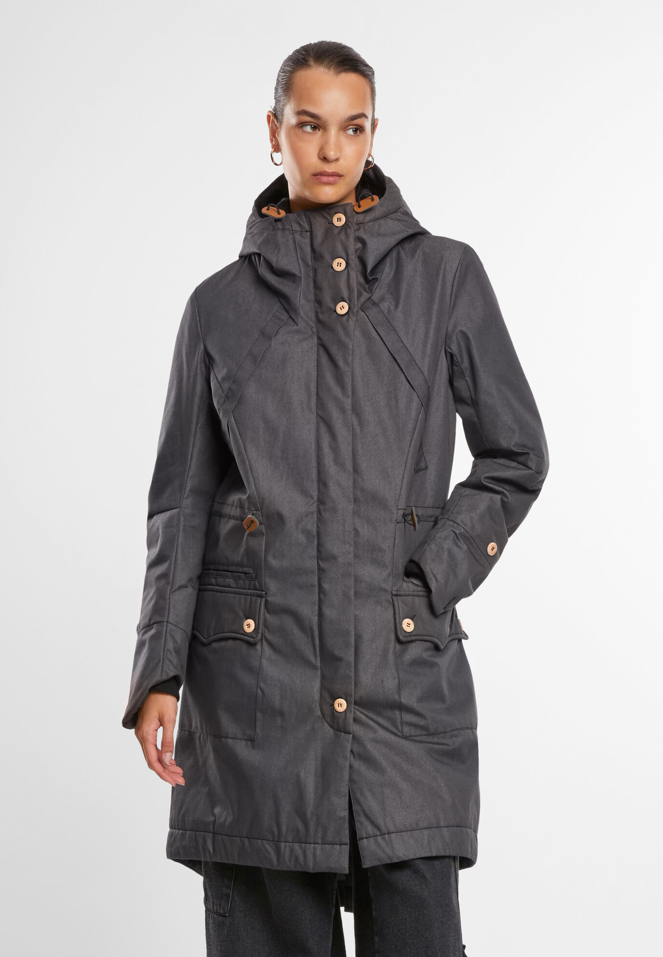 Langer super bequemer Mantel / Gefütterte einstellbare Kapuze / Hoher Kragen / Einschubtaschen und aufgesetzte Taschen mit Knopfverschluss / Kunstlederdetails / Reissverschluss mit Windschutzleiste / Innentaschen / Strickrippbündchen an den Ärmelenden / Tallienzugband / Gehschlitz