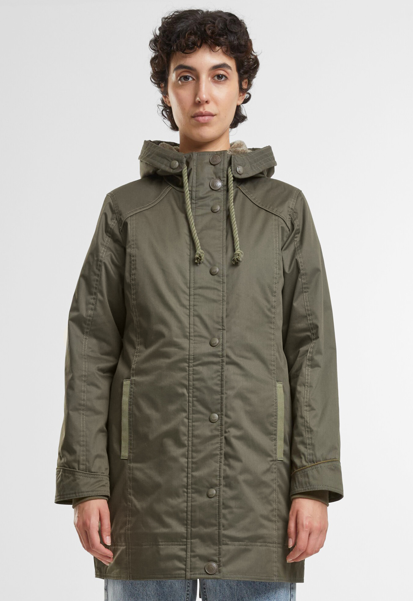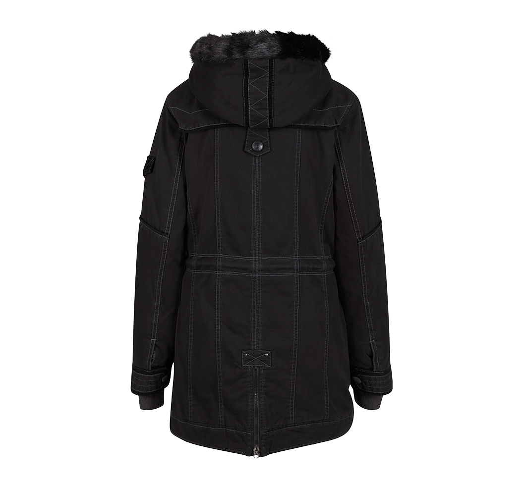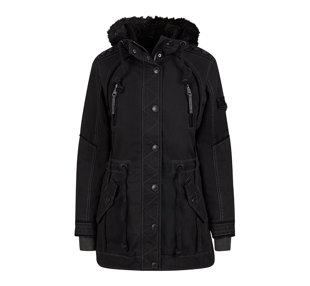 Obermaterial: 68% Polyester, 35 % Baumwolle / Rückseite mit Chlorfaser beschichtet / Futter: 100 % Baumwolle / Ärmelfutter: 100 % Polyester / Kapuzenfutter Kunstfell: 100 % Polyester / Wattierung: 100 % Polyester / Rippstrick: 93 % Baumwolle, 7 % Elasthan