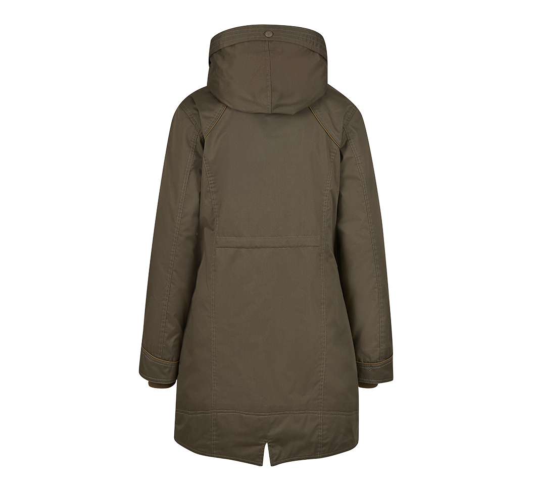 Langer gefütterter Mantel / Hoher Kragen / Gefütterte Kapuze / 2 Einschubtaschen / Innentasche / Strickrippbündchen an den Ärmelenden / Kordelzug / Logoknöpfe / Reissverschluss mit Windschutzleiste / Gehschlitz