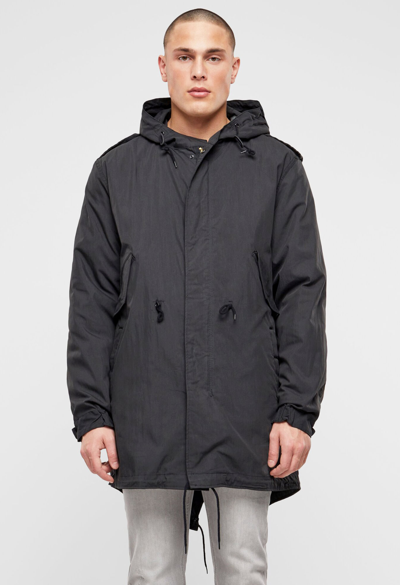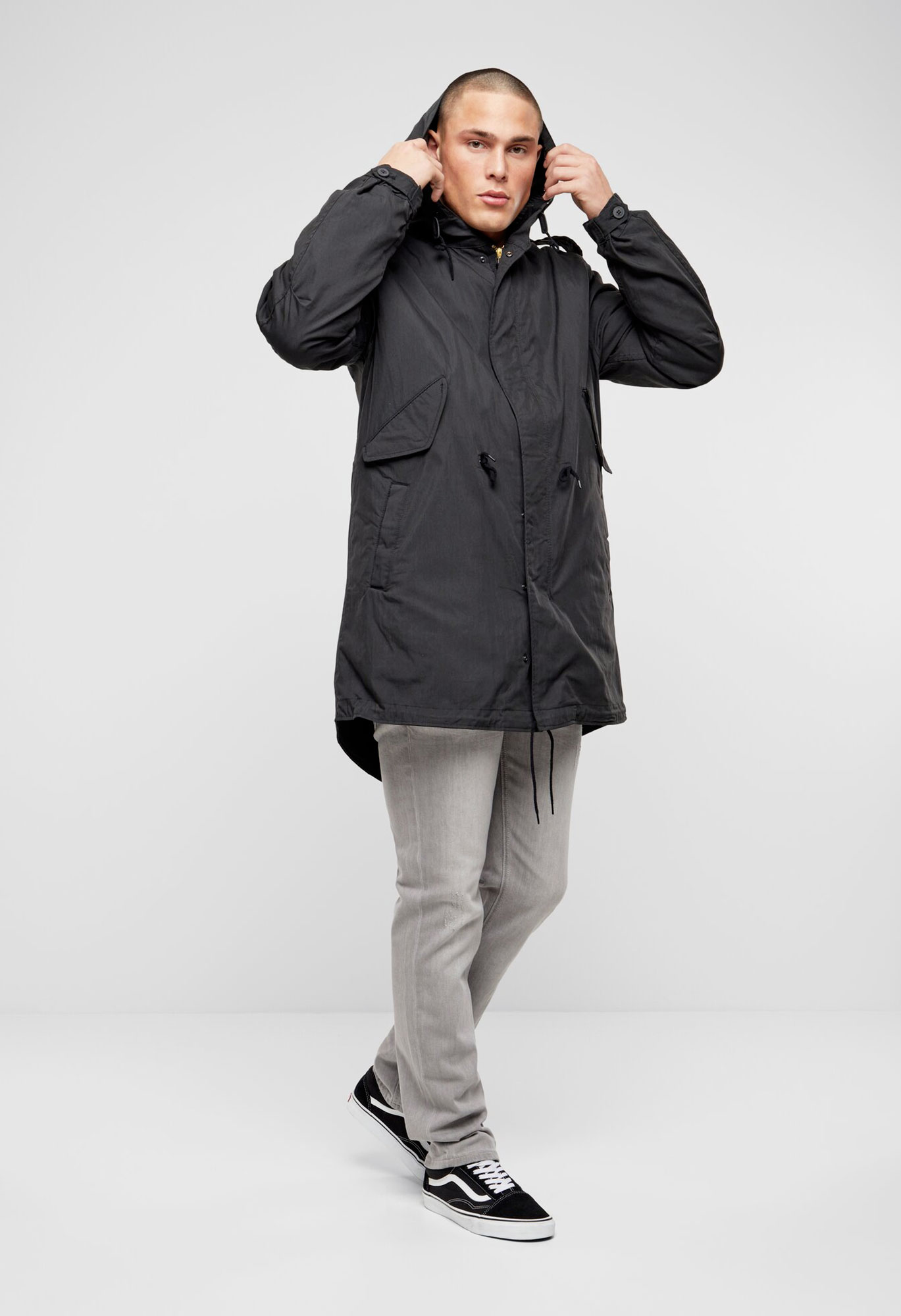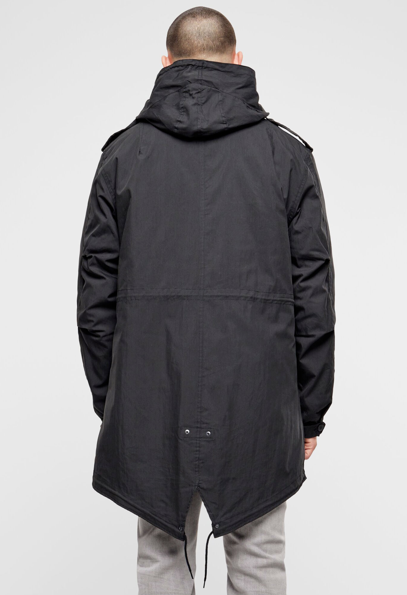 fishtail execution / regular civilian sizes and cut / big hood with drawstring / authentic military-style print / detachable thermo lining / high-quality zipper with zip-puller / two side pockets with fleece lining / two Napoleonpockets with snap button closure / adjustable waist