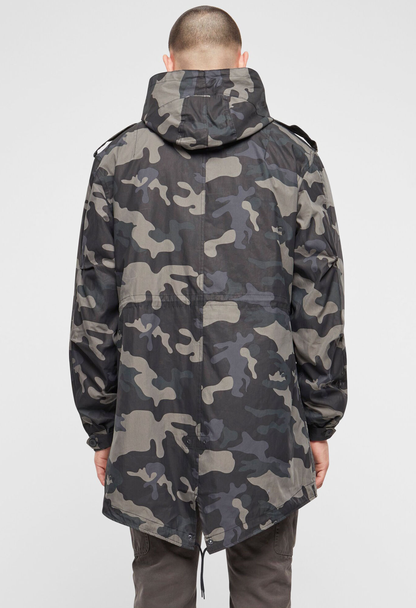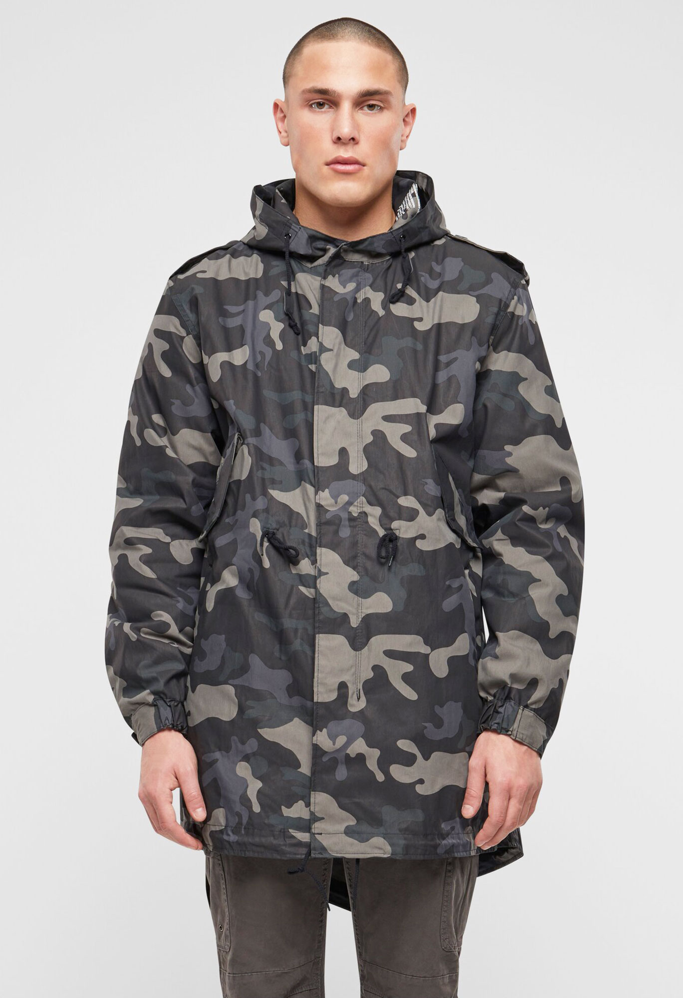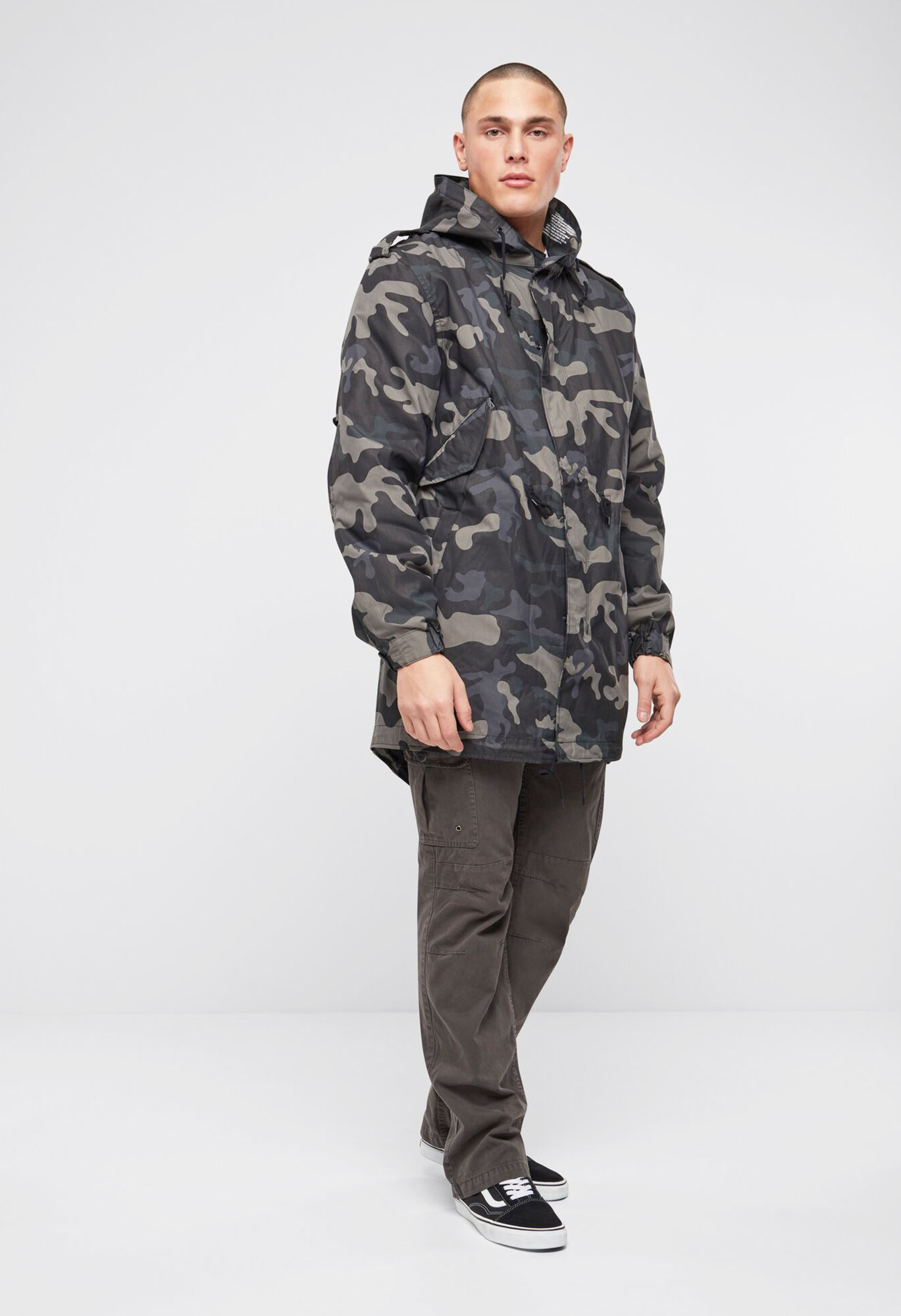 fishtail execution / regular civilian sizes and cut / big hood with drawstring / authentic military-style print / detachable thermo lining / high-quality zipper with zip-puller / two side pockets with fleece lining / two Napoleonpockets with snap button closure / adjustable waist