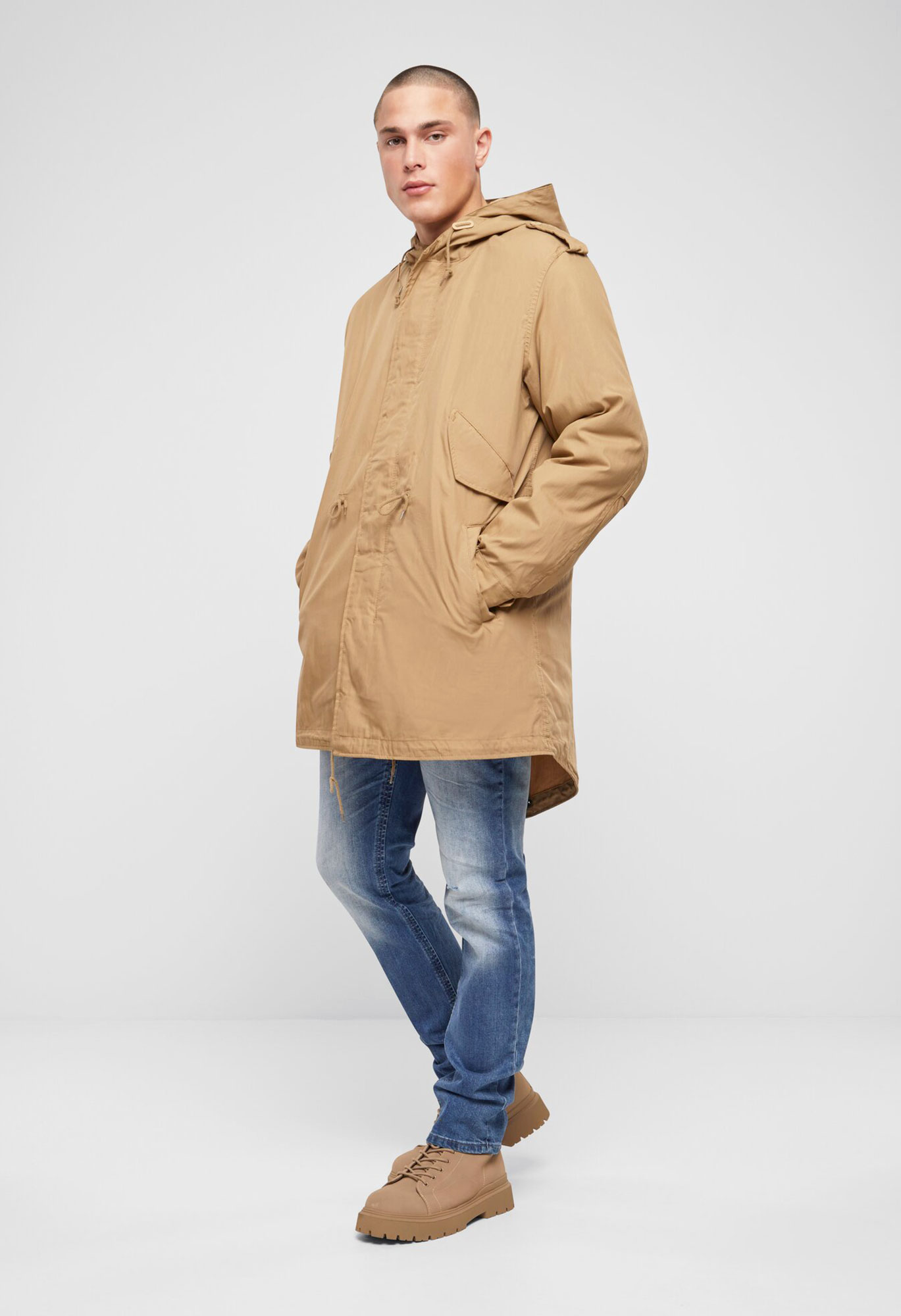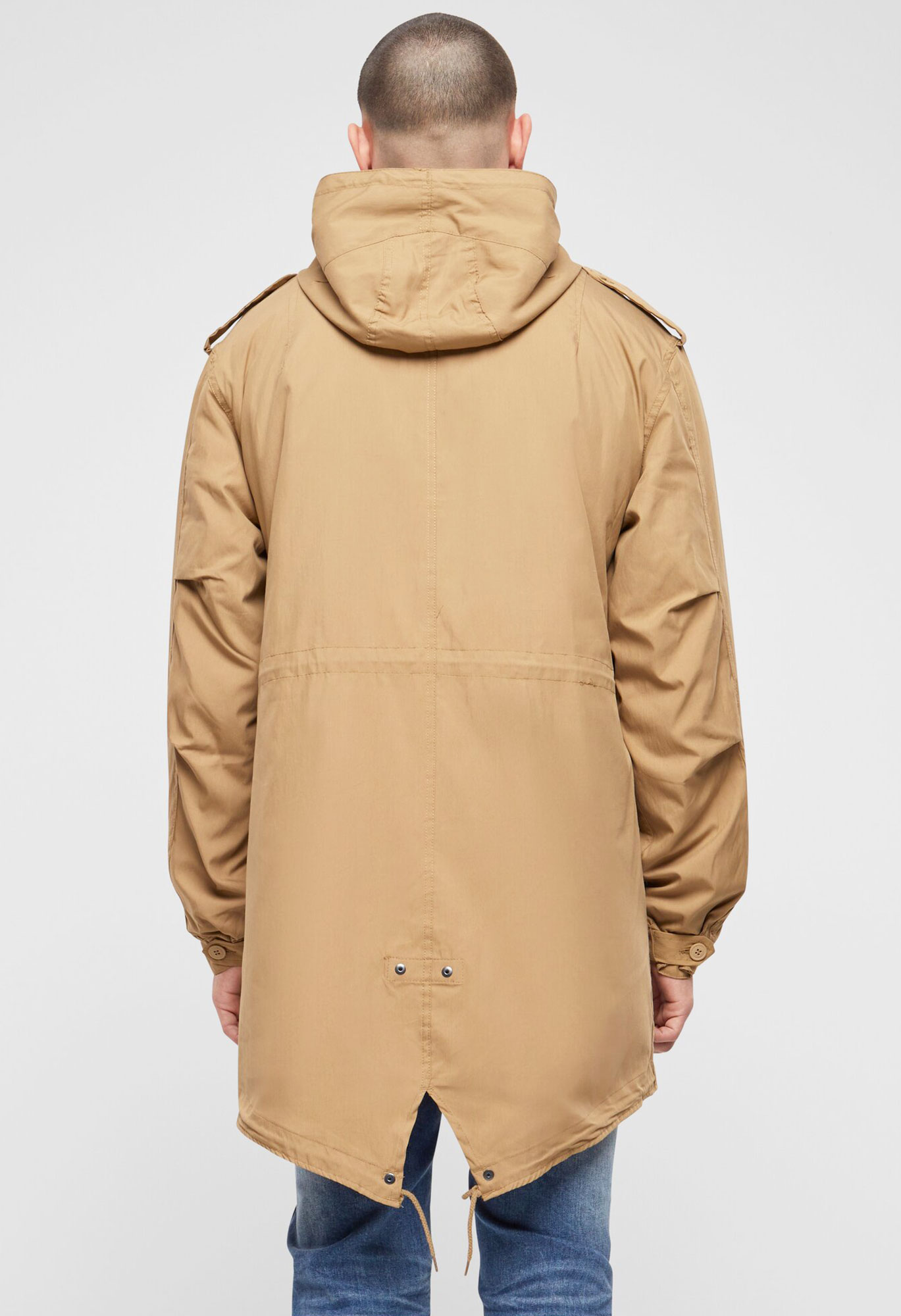 fishtail execution / regular civilian sizes and cut / big hood with drawstring / authentic military-style print / detachable thermo lining / high-quality zipper with zip-puller / two side pockets with fleece lining / two Napoleonpockets with snap button closure / adjustable waist