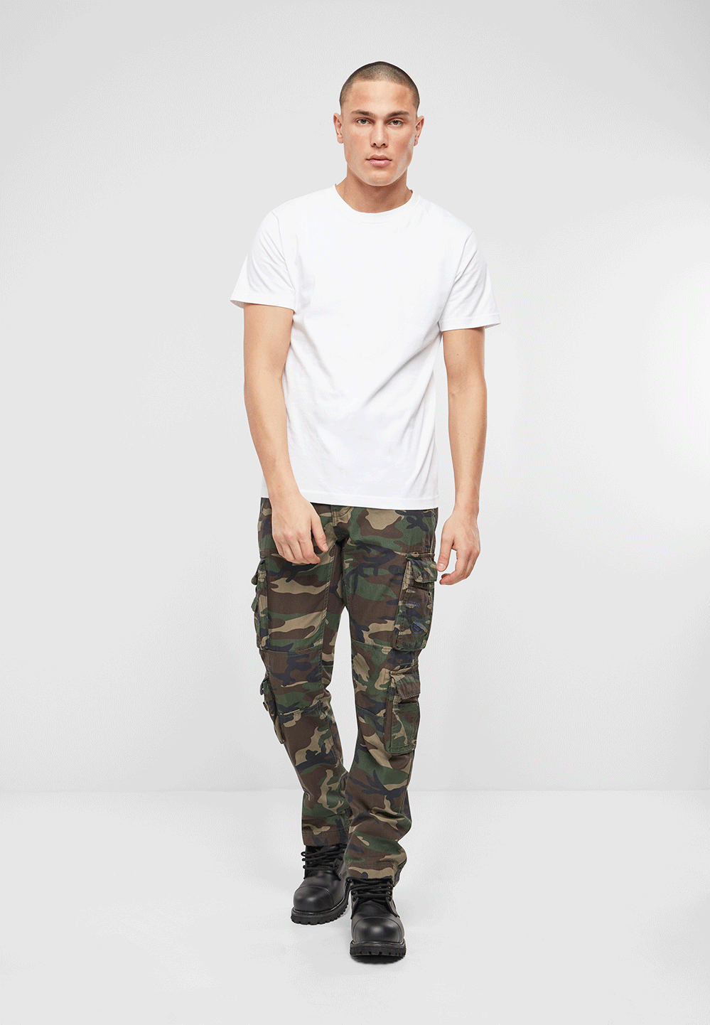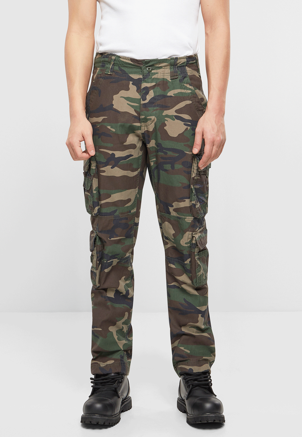 stylish slim fit cargo pants / robust, skin-friendly cotton material / slim fit / adjustable waistband with drawstring / high quality button placket / 2 side slit pockets / 4 practical cargo pockets with push button closure / 2 back pockets / strong belt loops / modern print on a cargo pocket