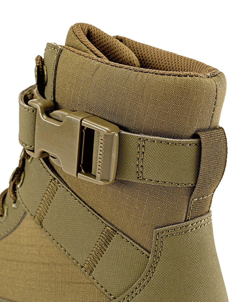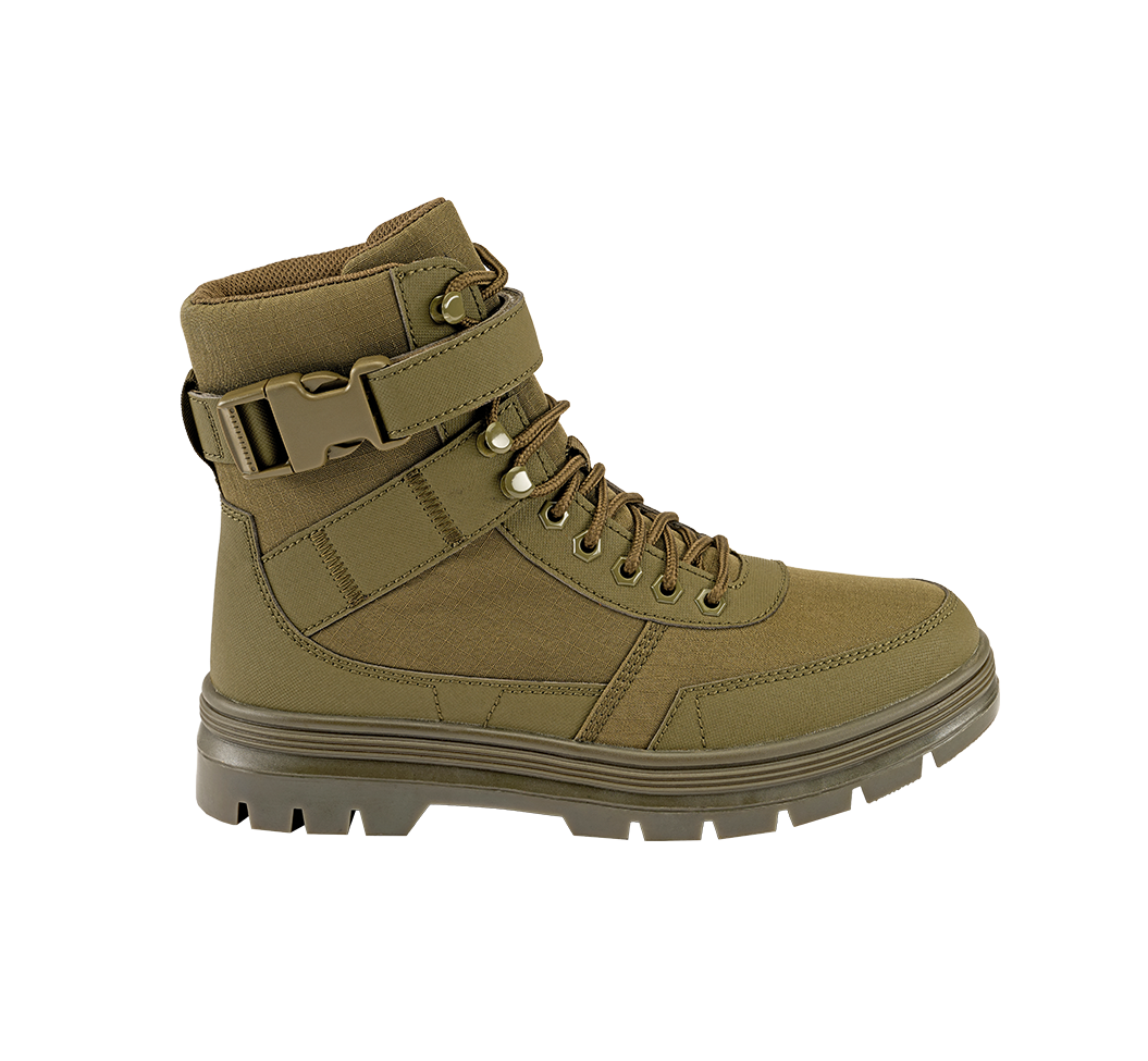 Stylish tactical boot / water-repellent material / ripstop / debris protection / clip fastener / rubber sole / high wearing comfort / appliqués