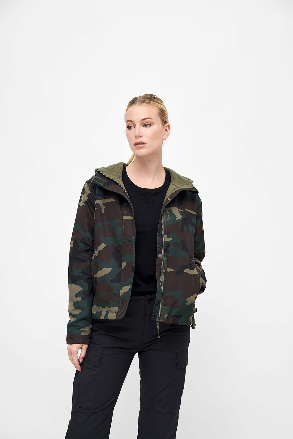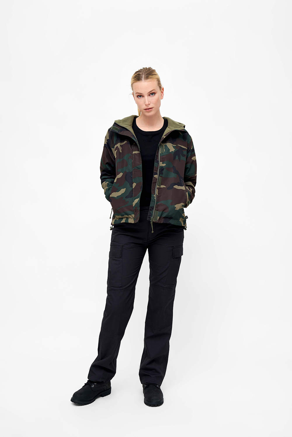 warm fleece lining / wind and water repellent outer material / stable front zipper / storm flap with hook and loop / lined hood with drawstring /arm cuff with hook and loop closure / two side pockets with zipper / inside pocket