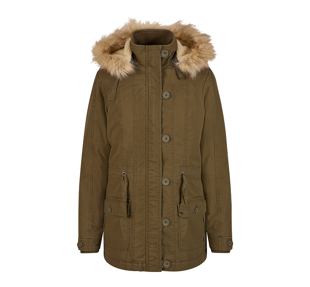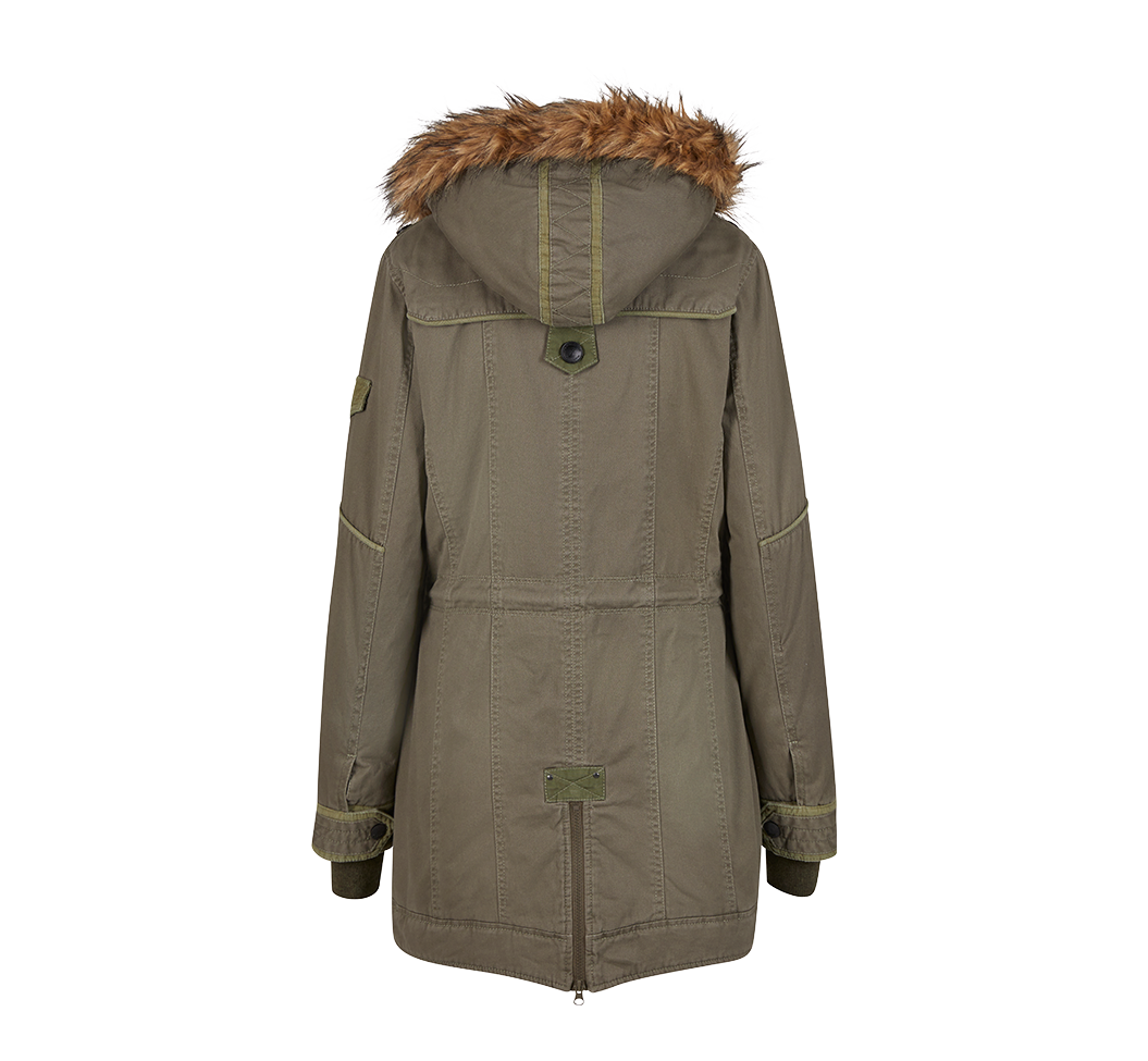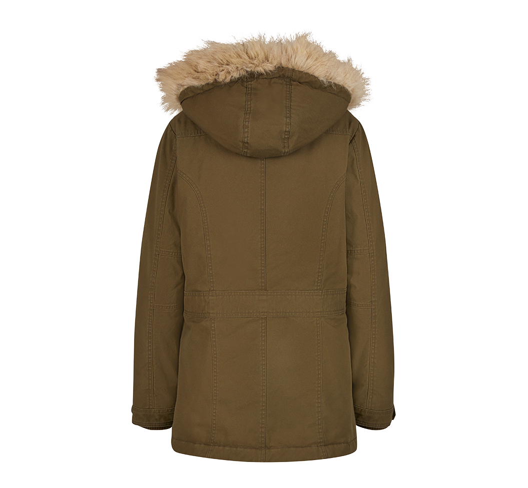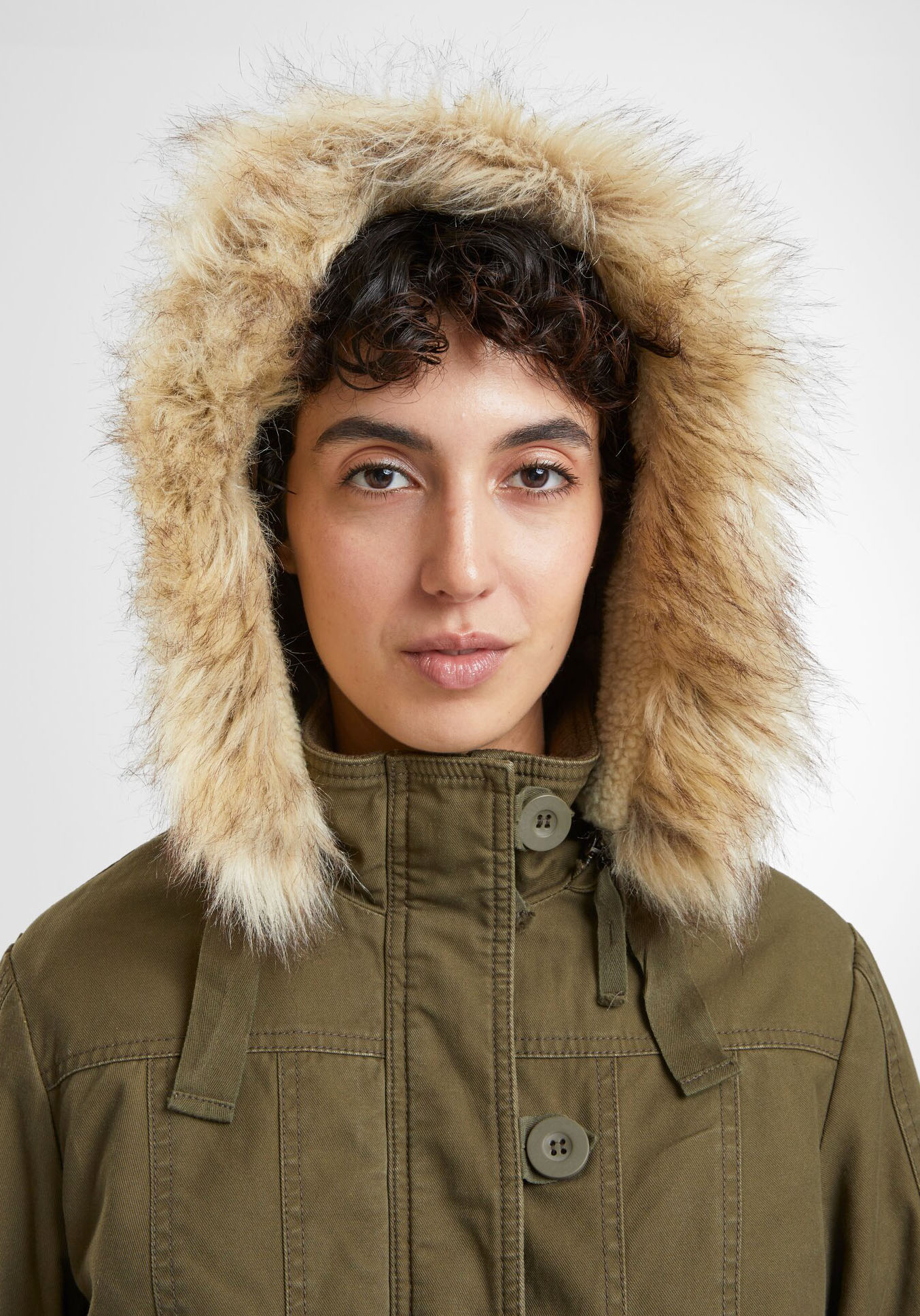 Warm and stylish parka / drawstring waist / 2 patch pockets / zipper with wind flap / lined / hood with teddy lining / detachable faux fur collar / knitted ribbed cuffs / inside pocket / high collar / very comfortable to wear